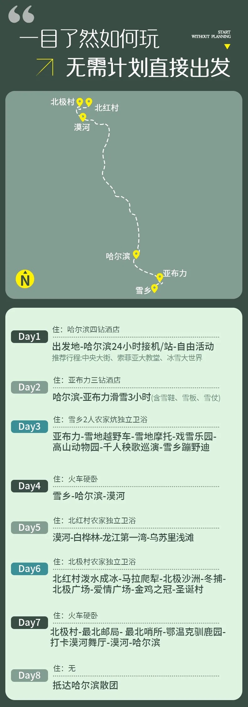 北极村-最北邮局-最北哨所-鄂温克驯鹿园-漠河舞厅-漠河(90KM,车程约1.5小时)-哈尔滨