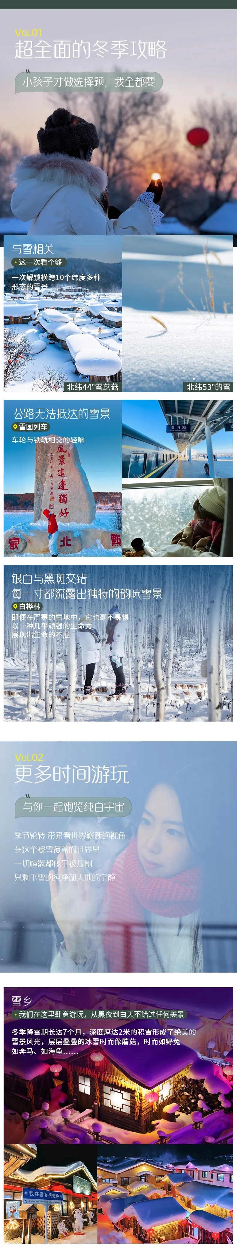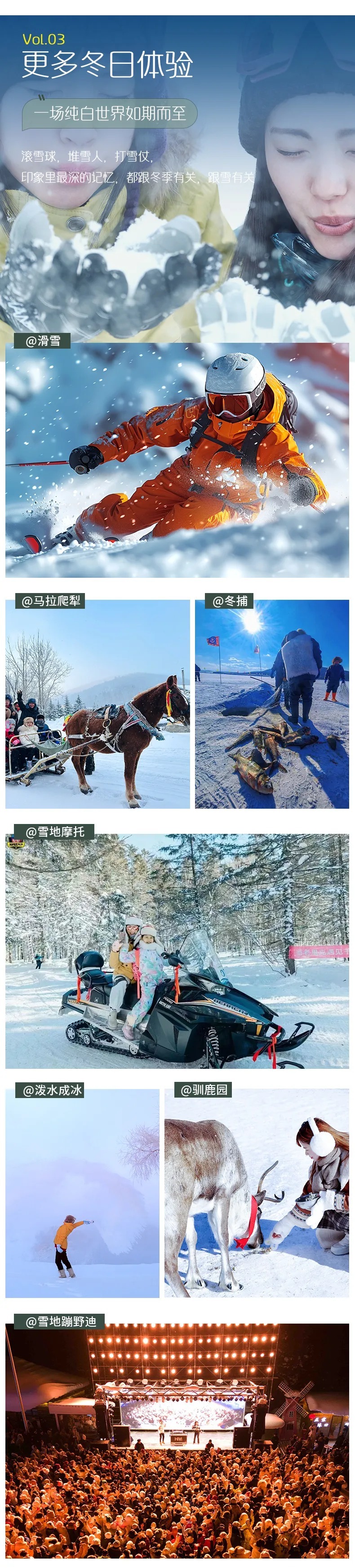 4、门票:亚布力2小时滑雪包含雪鞋雪板雪杖使用、雪乡门票+往返环保车、龙江第一湾门票+环保车、圣诞村门票、北极村门票、鄂温克驯鹿园;