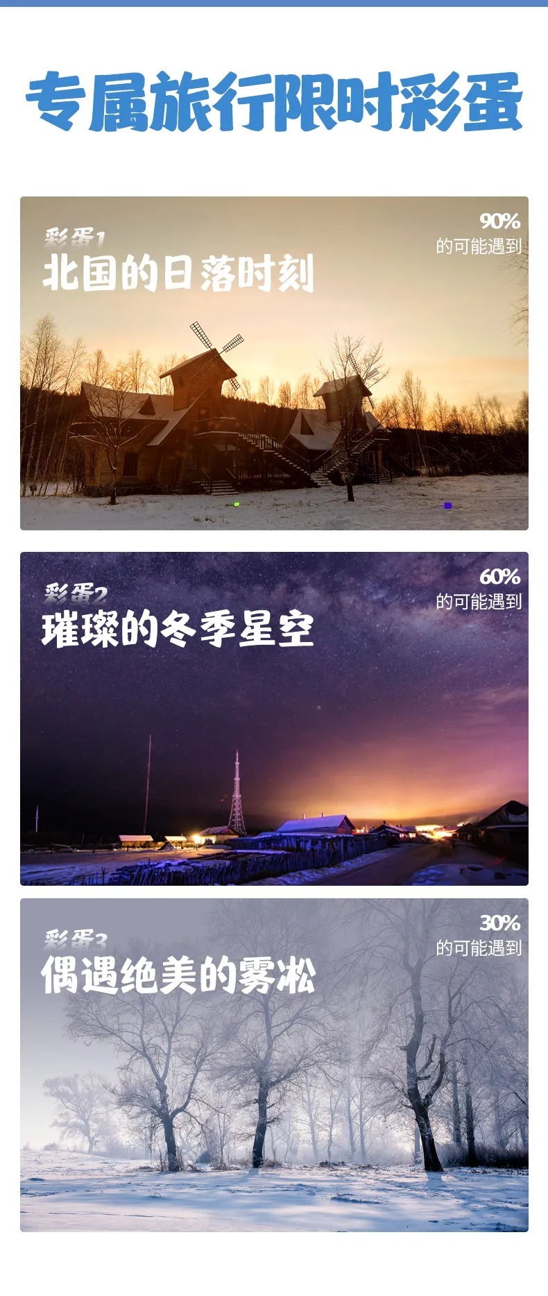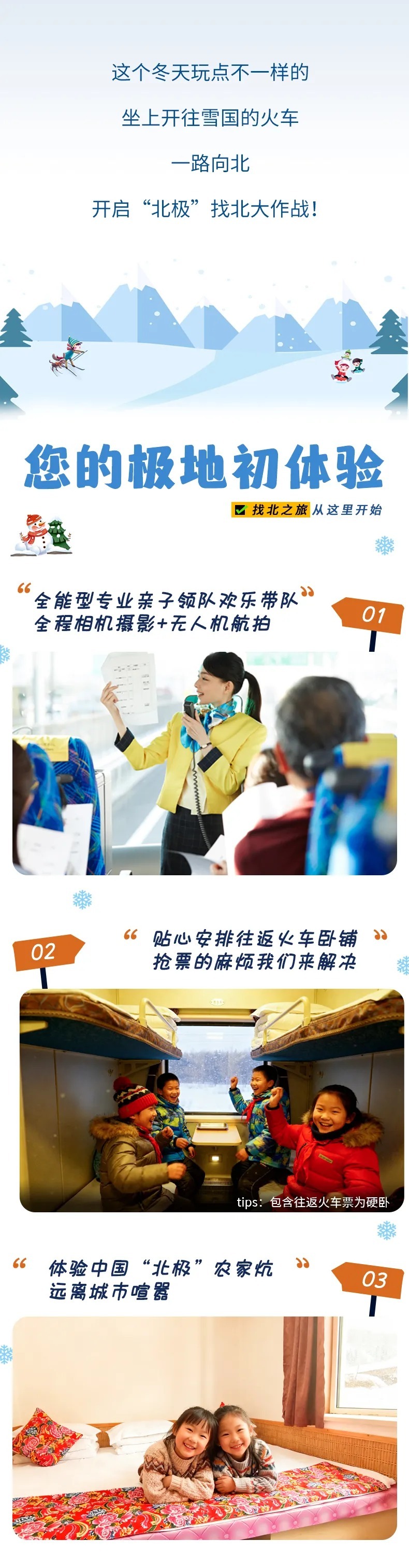 4、门票:龙江第一湾门票+环保车、圣诞村门票、北极村门票、驯鹿园;