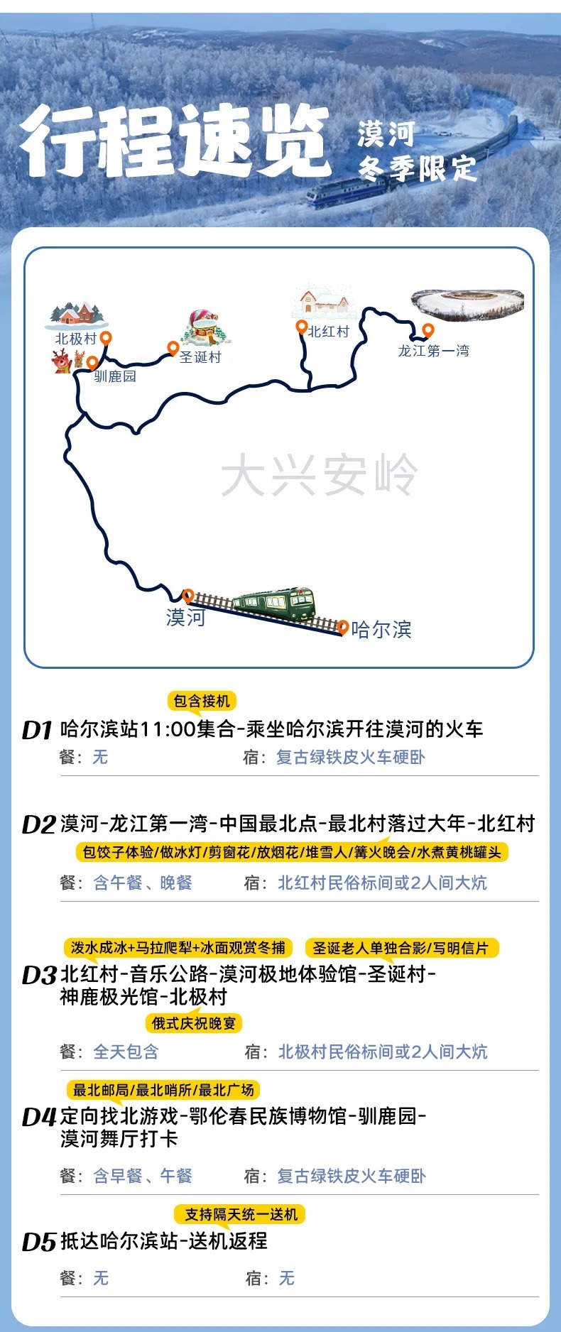 6、火车:哈尔滨-漠河往返火车硬卧(铺位随机,一起报名的小伙伴尽量安排同一节车厢,但冬季票务紧张无法保证,建议提前15天以上预定,15天以内报名请现询是否有票)