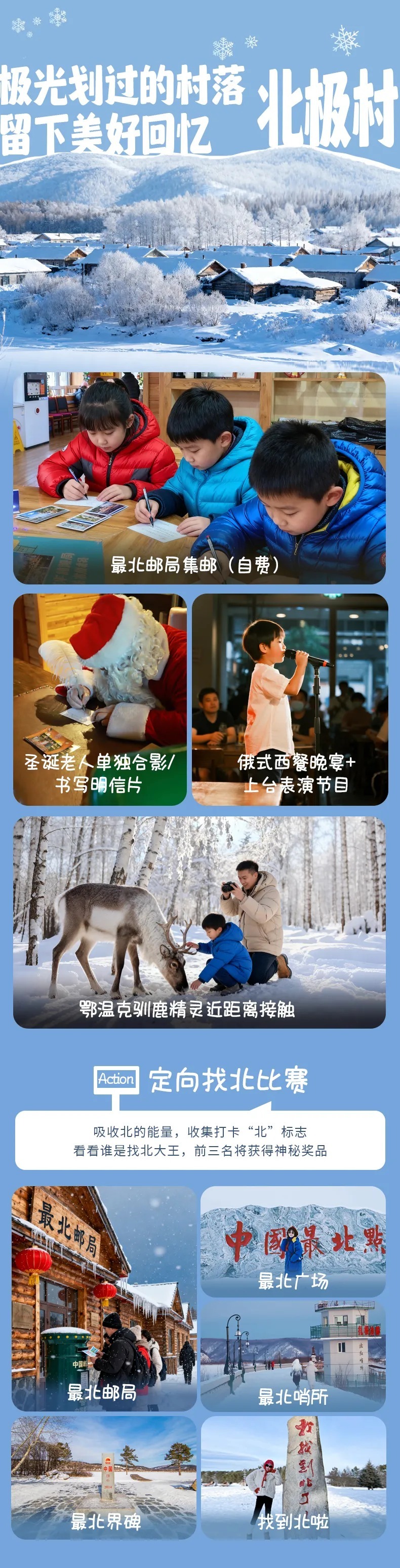 北红村-泼水成冰-马拉爬犁-冰面冬捕表演-音乐公路-(100km,车程约2h)漠河极地体验馆-圣诞村圣诞老人合影/明信片-神鹿极光馆-俄餐庆祝晚宴-北极村