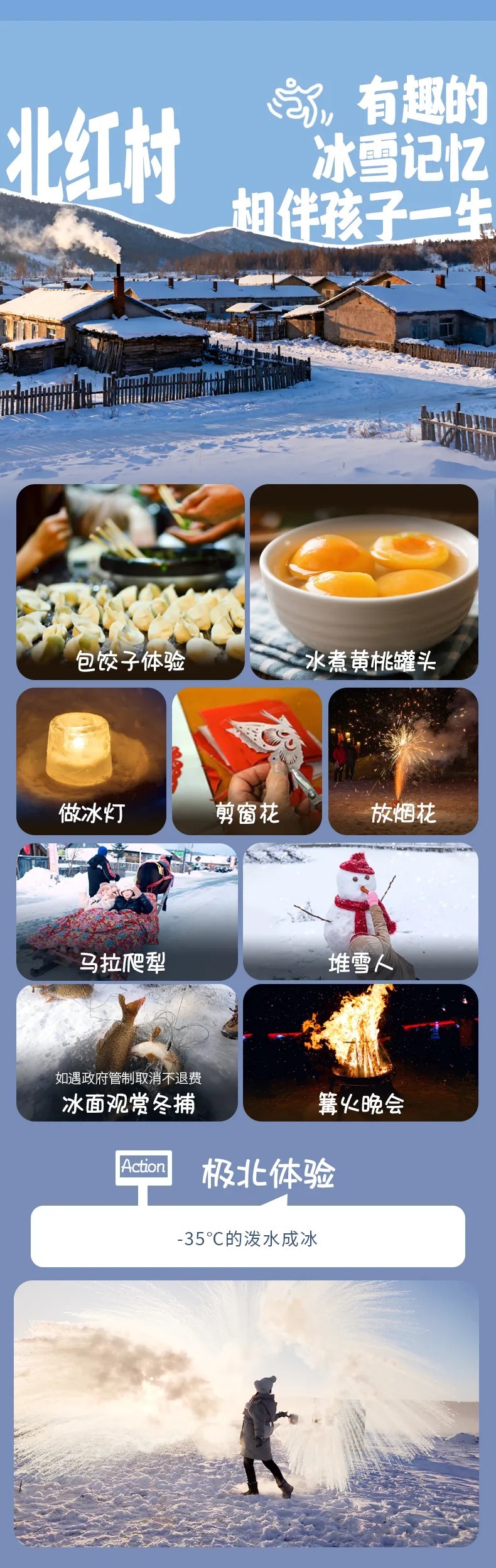 漠河-(140km,约3h)龙江第一湾-中国最北点-(38km,约1h)最北村落过大年-包饺子体验/做冰灯/放烟花/剪窗花/堆雪人/篝火晚会/水煮黄桃罐头-北红村