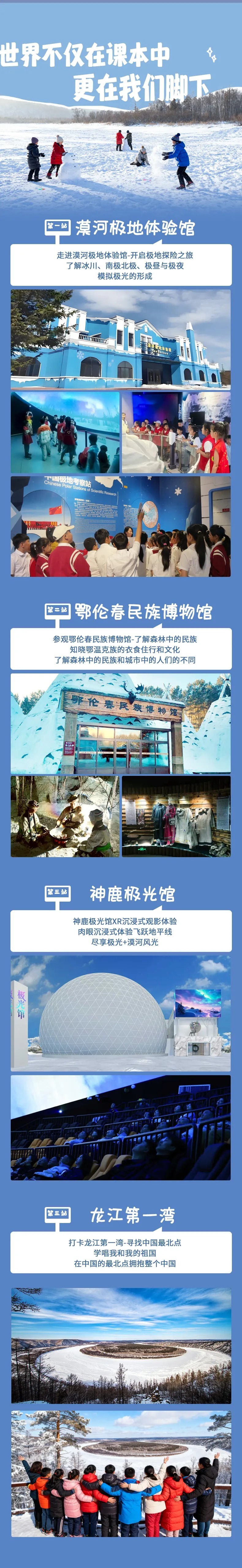 14 : 00接下来抵达【漠河极地体验馆】,这里是中国首个以极地探险为主题的科技馆,我们在这里可以了解到极地知识、看到极光的形成原理、动态展示冰川地质演变机制等等;冰与雪在小朋友们的心里有了具体的概念,极地地理知识在心里埋下了小小的种子。