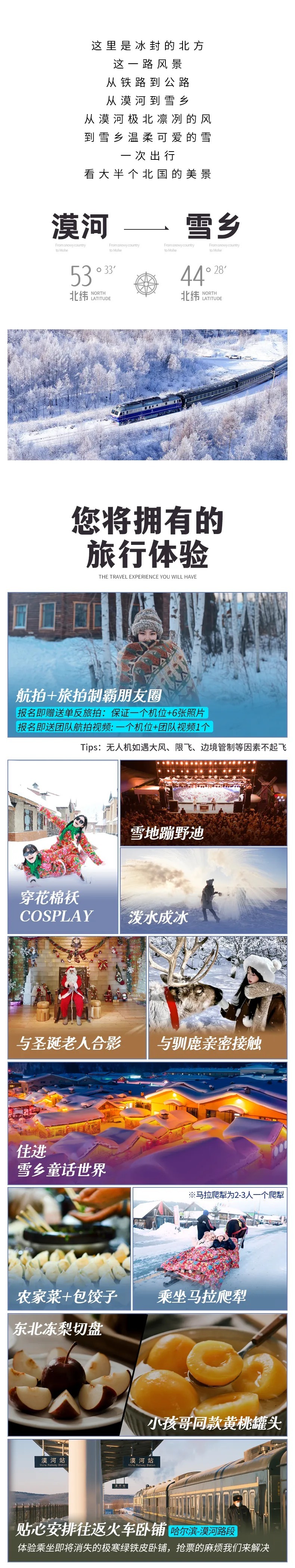 漠河-白桦林雪地轻徒步2km-(150km,车程约2.5小时)龙江第一湾-乌苏里浅滩-(40km,车程约1小时)北红村-东北特色农家菜-包饺子体验-水煮黄桃罐头-冻梨拼盘