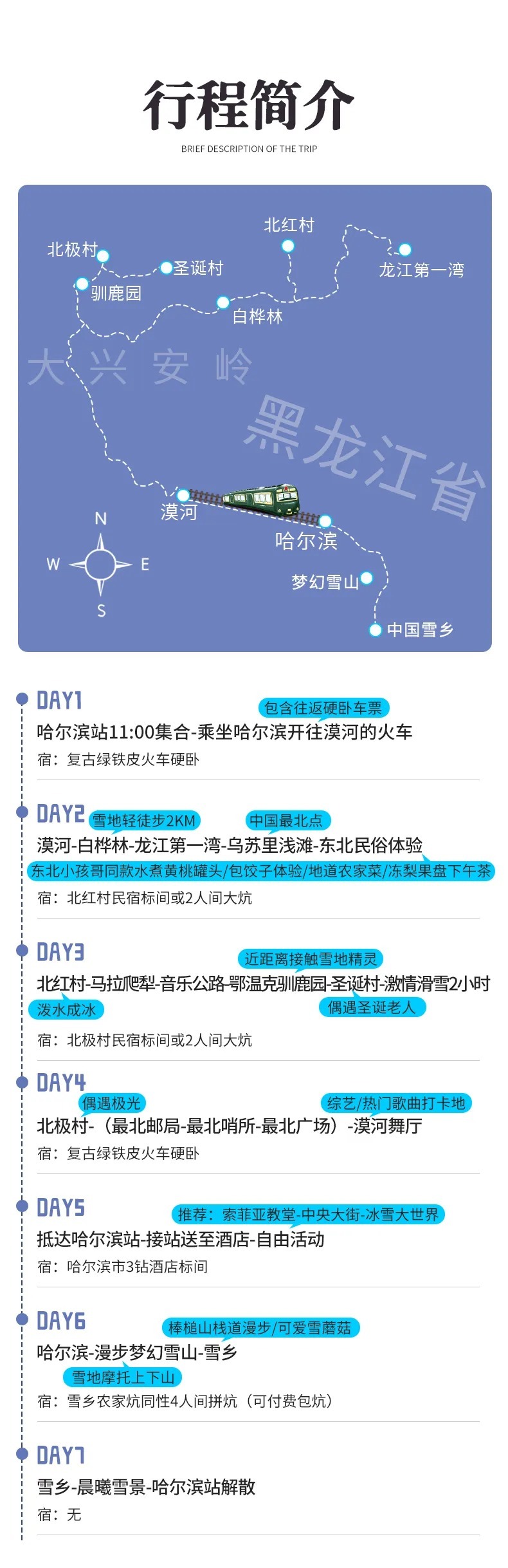 北极村-最北邮局-最北哨所-最北广场-漠河舞厅-漠河(90km,车程约1.5小时)-漠河-哈尔滨硬卧