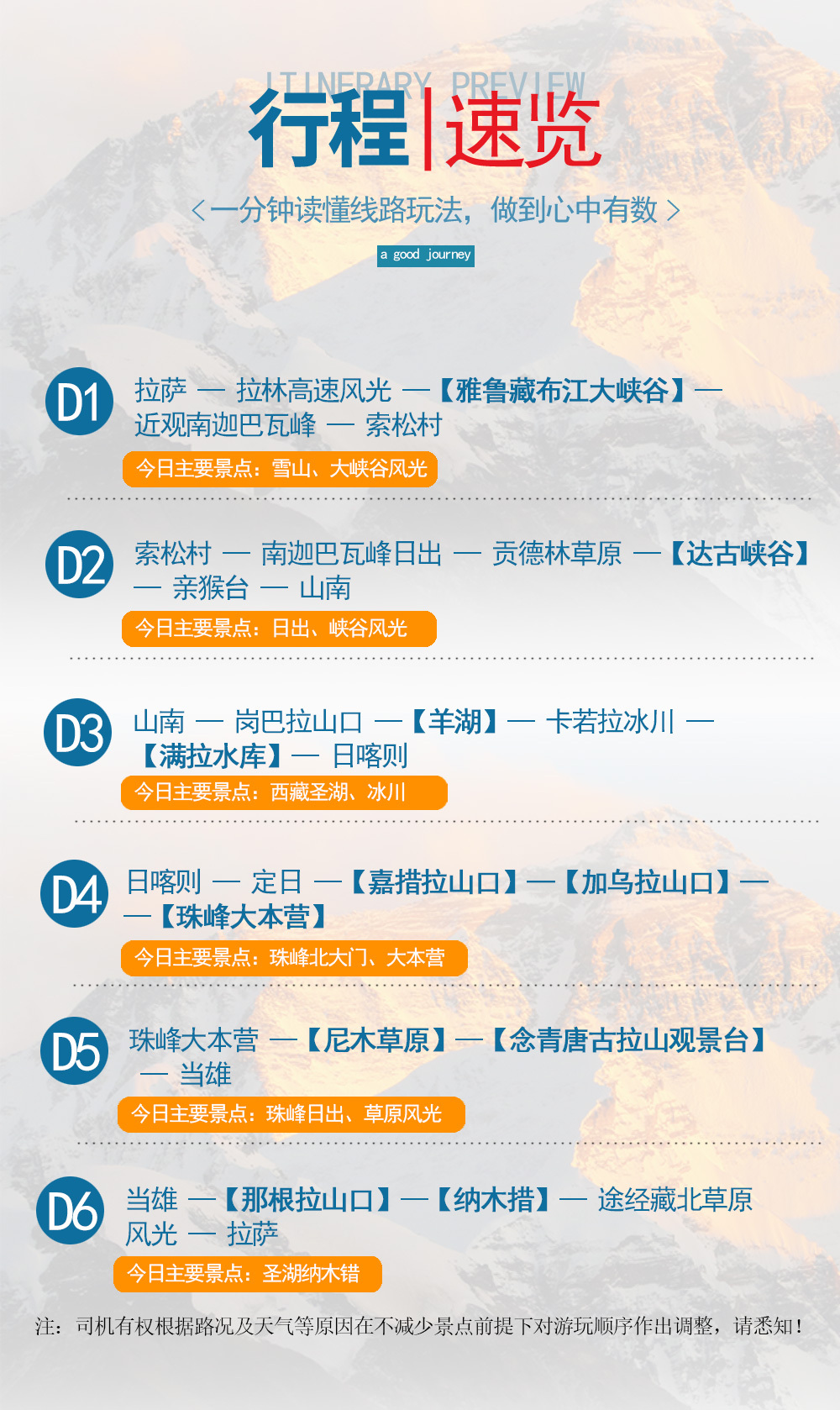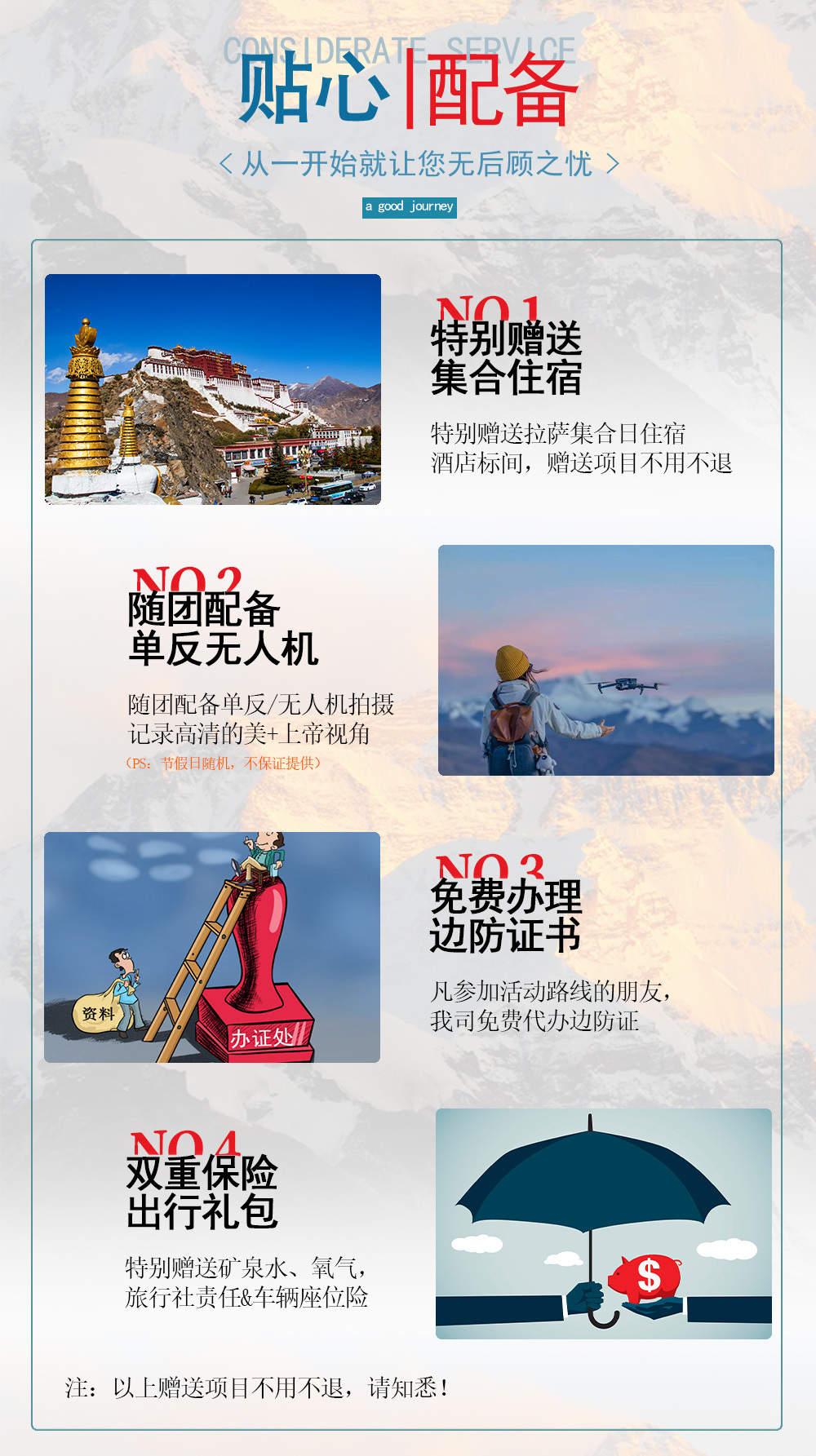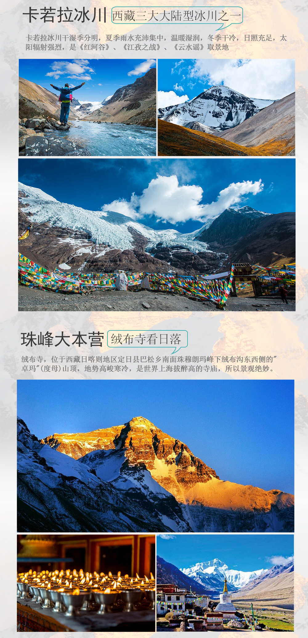 3、门票:行程所列景点门票及观光车全含,统一办理边防证;(门票明细:雅鲁藏布江大峡谷、羊湖、卡若拉冰川、珠峰门票+观光车、纳木错门票+观光车),此价格已享受门票减免政策,景点不去不退费用,请悉知!