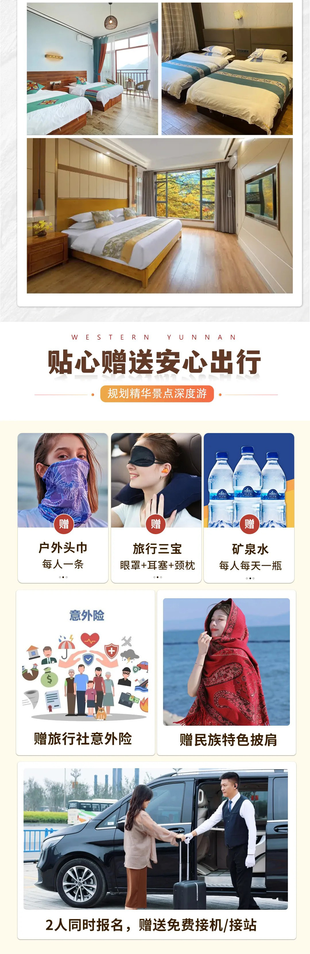 3. 个人洗簌用品(当地条件有限,部分地方没有一次性洗刷用品)、换洗衣物;4. 常备药品(晕车药,创可贴)、防晒用品;5. 徒步鞋(或防滑运动鞋)、水壶、太阳眼镜、充电器、雨具、帽子、个人证件(身份证!!必带)、6. 零食(老人,孩子可以适当带一些零食,部分地方行车时间较长)。