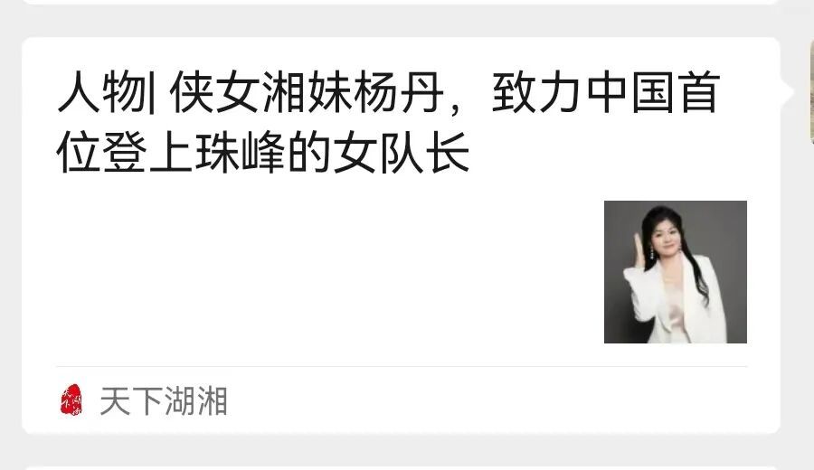 2025年7月12日,报《天下湖湘》报导《侠女湘妹杨丹,致力中国首位登上珠峰的女队长》