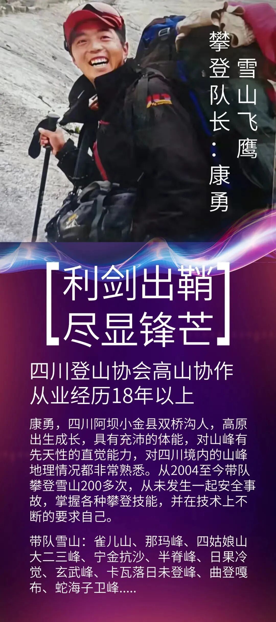 专业人员符合体育总局要求(标准团不低于1:3)配置专业高山向导;所有向导均具有7000米及以上攀登经验/或慕峰登顶经历;