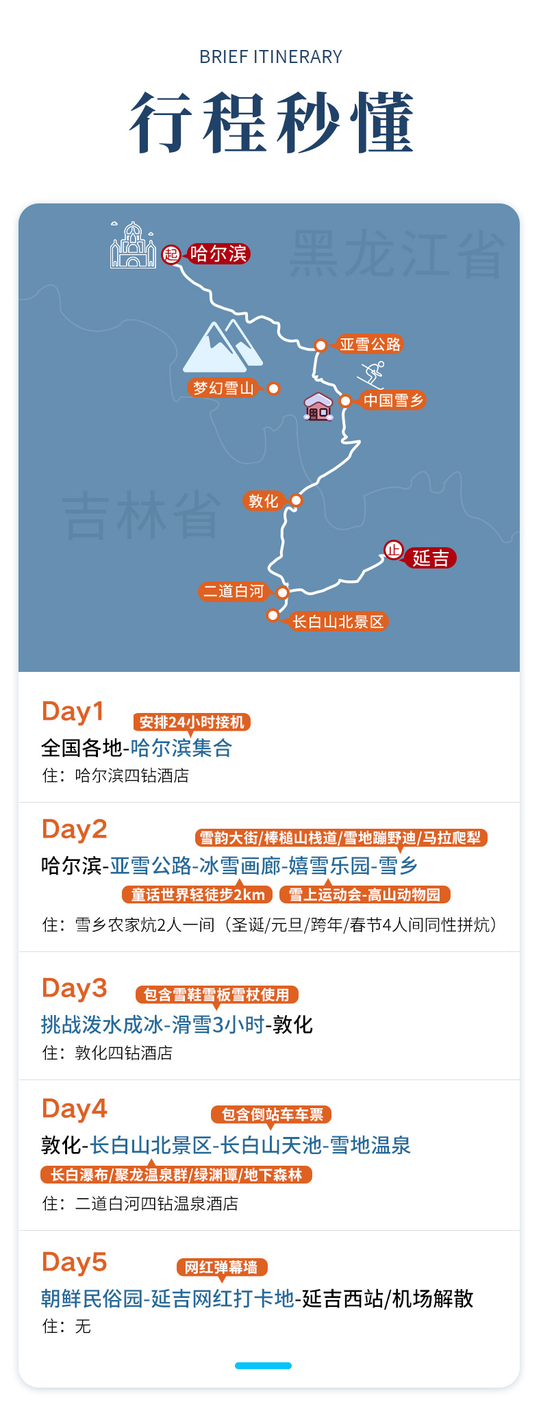 4、门票:雪乡门票+往返环保车、冰雪画廊轻徒步门票、朝鲜民俗园门票、长白山北景区全含(门票+往返环保车+摆渡车+天池倒站车)、雪乡滑雪3小时包含雪鞋雪板雪杖使用(滑雪时间从取雪具开始计算,到还雪具结束);