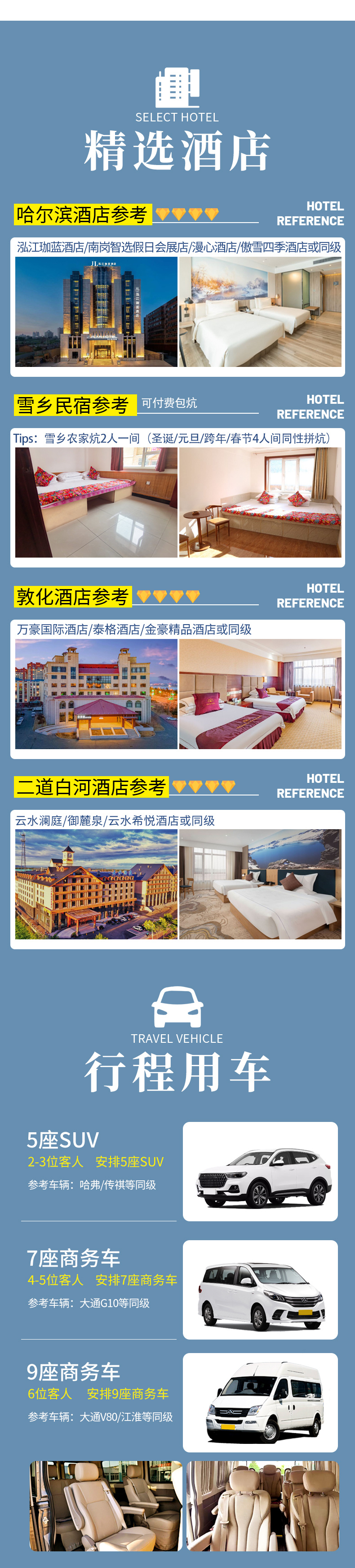 3、用车:2-3客人用5座SUV,4-5客人用7座商务车,6客人用9座商务车,7-8客人用大九座商务车,保证旅途舒适舒心。(小团副驾驶及前后座位置需要轮流乘坐,望悉知)