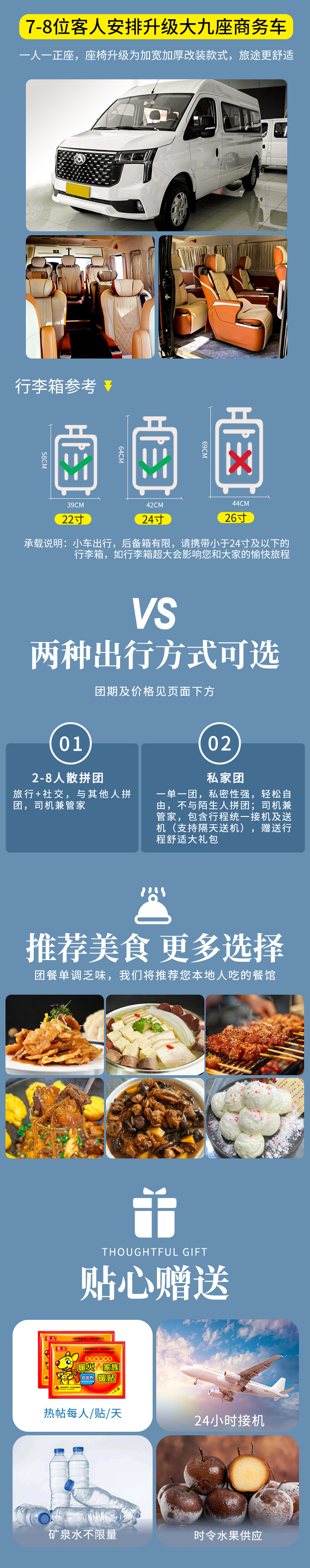 3、赠送24小时接机服务,1人也可接,前后航班相差半小时需等待,提前2日预定,否则视为自动放弃;接机车辆非行程用车并且无空座率。