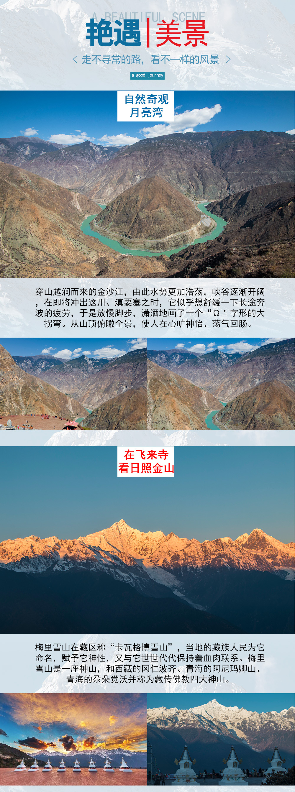 清晨我们将出发前往飞来寺,而后经过风吹草地见牛羊的【小中甸】,感受不一样的香格里拉草原风光,而后继续前行到达奔子栏享受午餐。而后途经【月亮湾】,那一刻我们将会体会到所有幻想家的梦想。