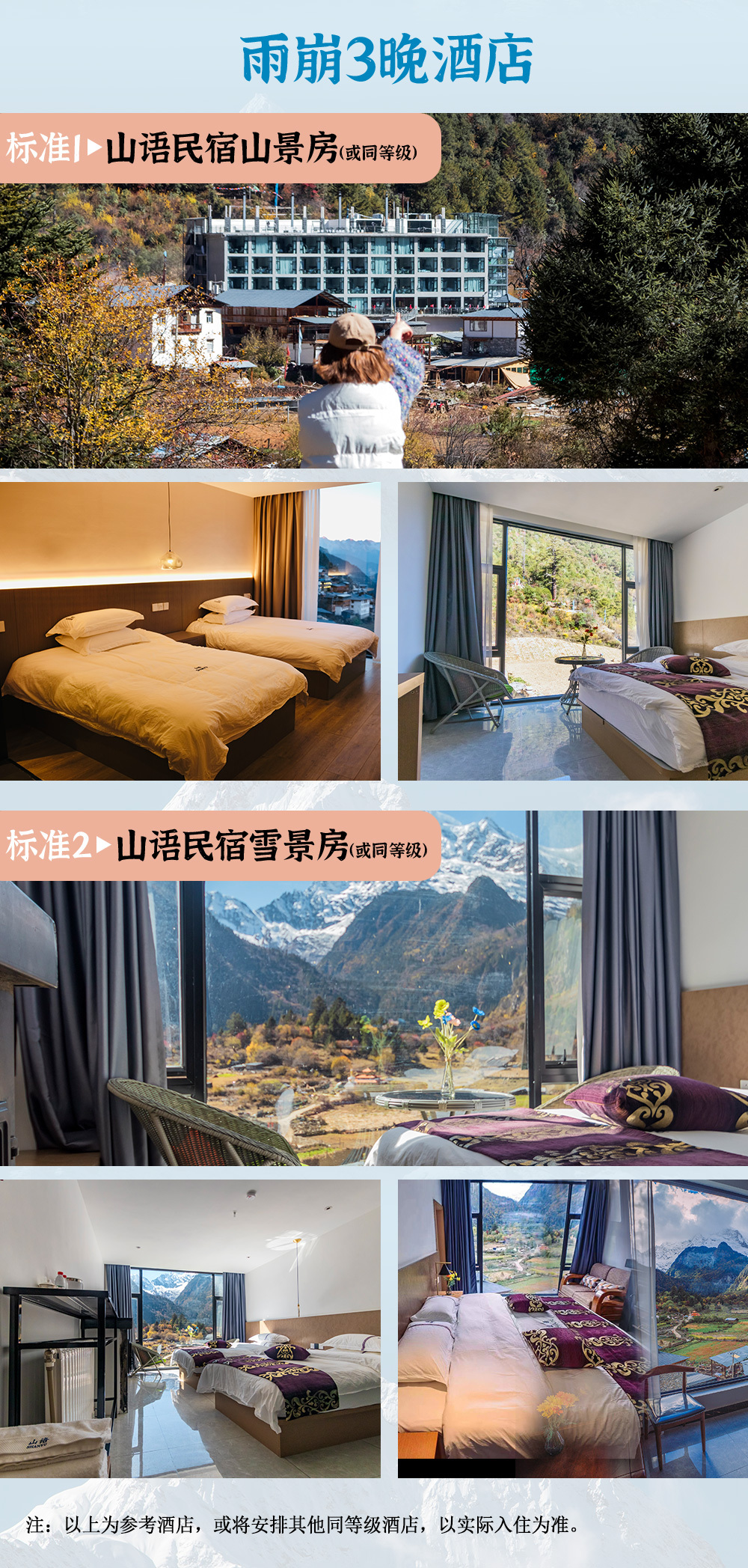 1.住宿:全程5晚标间住宿(丽江1晚、雨崩3晚、飞来寺 1晚);丽江住宿为赠送不用不退;住宿标准仅为雨崩村内三晚住宿区别,其他点住宿一致。