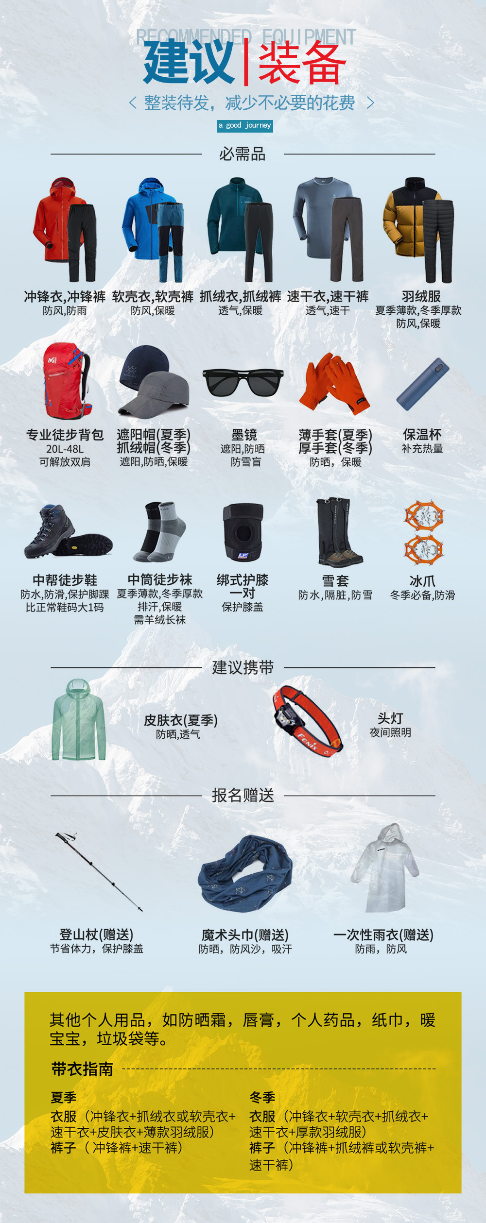 装备:登山杖1根(免费使用)、矿泉水1瓶、魔术头巾1条;