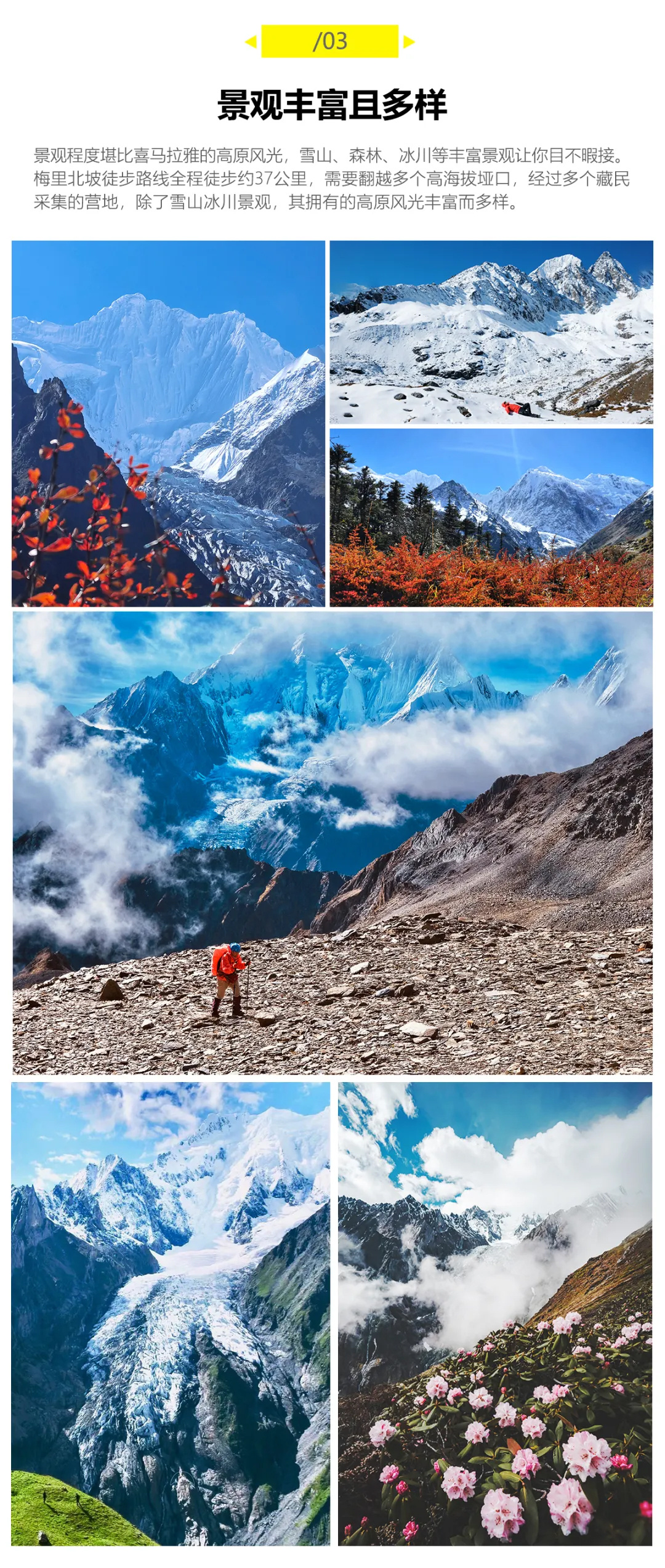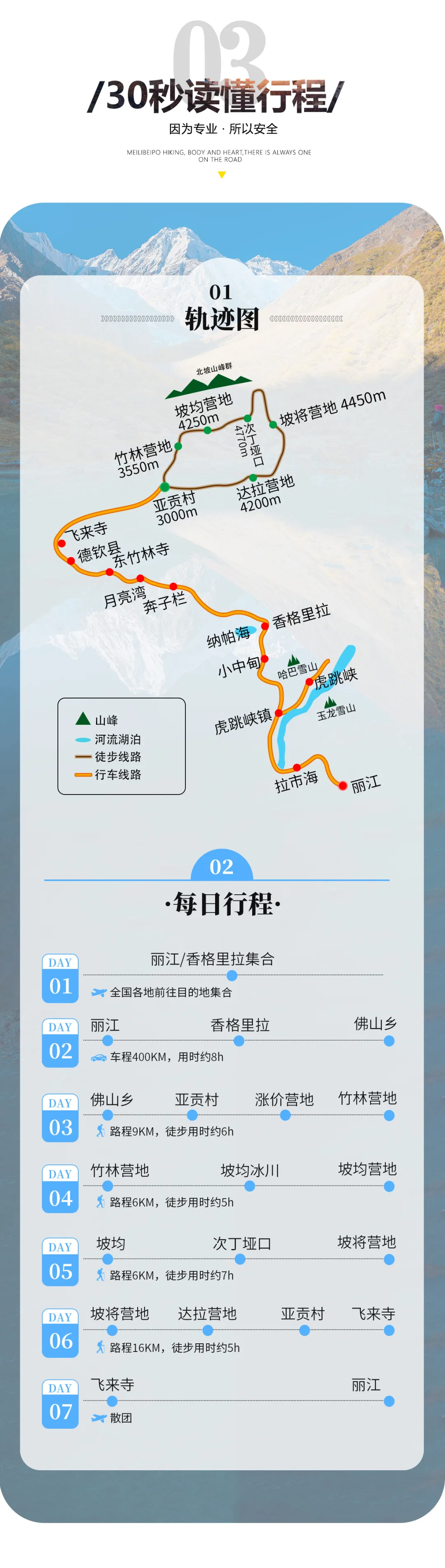 5、体力要求:本次行程全程轻装,每天徒步5~8小时,身体健康,有一定户外经验,无重大疾病史者均可参加。6、文化禁忌:进入少数民族聚集区,当地以藏族为主,请尊重民族信仰,严禁任何歧视以及践踏信仰行为,任何因此类行为产生的后果行为自负。