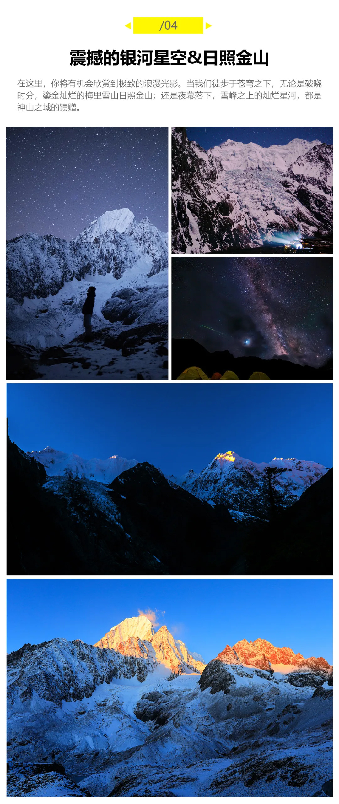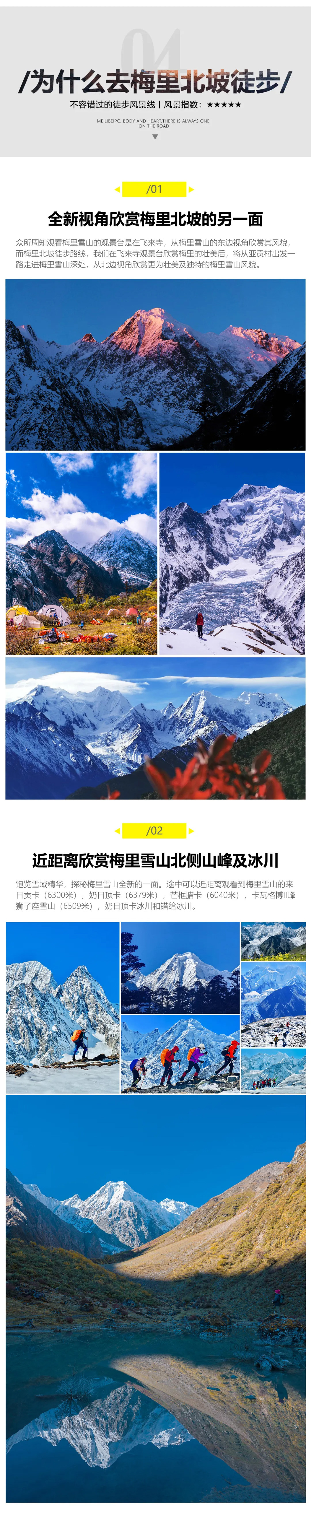 早上天气好可以拍摄梅里北坡日照金山。早餐后出发,离开营地通过一个小牧场后开始爬垭口。先经过一段很陡的碎石坡,之后继续沿山体爬升,到达4500米的冰川谷遗迹腹地,绕过面前的侧碛垄,继续向上,到达次丁垭口——本次行程的难点之一。一路都可观赏到奶日顶卡冰川,途中可以多个角度拍摄冰川。垭口之后走Z字形,下降300多米,到达谷底,便是坡将上方营地,海拔4450米,身后便是滇藏交界的5200垭口,这里电信、移动有4G信号。
