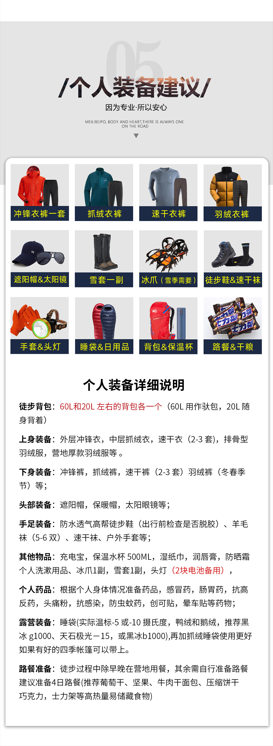 12. 头灯及备用电池——晚上帐篷内使用,及预防走夜路;13. 保温杯——建议700ml~1L,如遇恶劣天气,可以帮助身体快速复温;