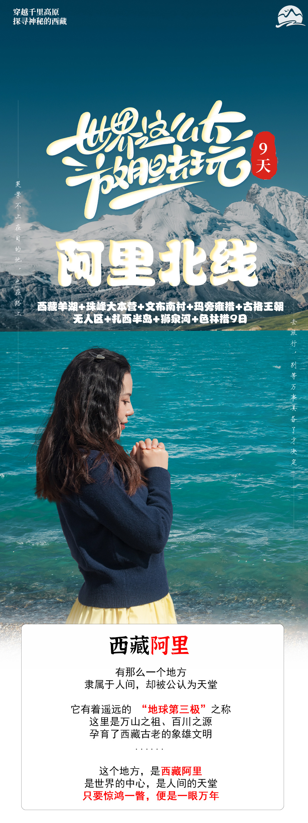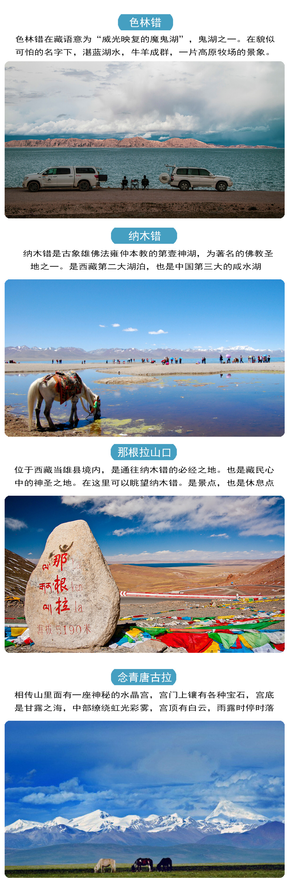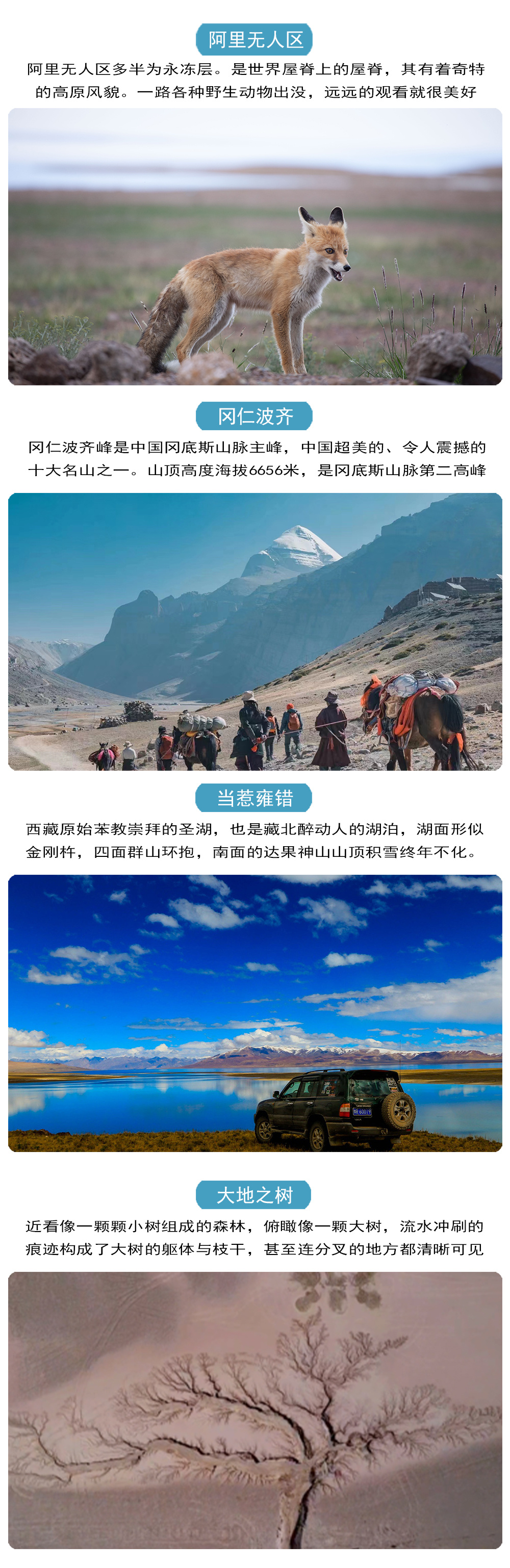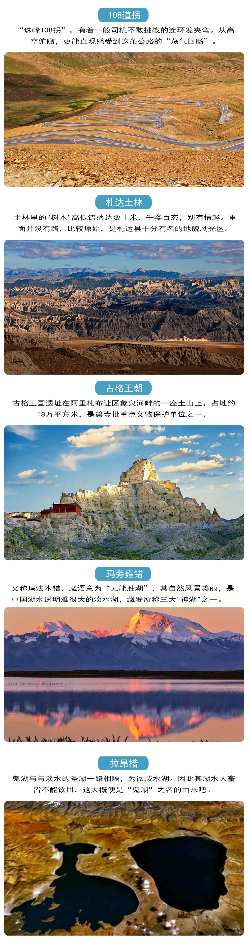 在岗仁波齐和纳木那尼峰中间迎着朝霞,前往玛旁雍措拉昂措参拜圣湖,玛旁雍错有“世界江河之母”的美誉,旁边有一个鬼湖,藏语叫“拉昂错”,意为“有毒的黑湖”而拉昂错是咸水湖。拉昂错是圣湖的近邻,风光同样美丽,湖水同样是蓝得心醉,可却被扣上“鬼湖”的恶命,被打入另册。由于湖色异常的美,所以有些旅行者喜欢走到湖边看个究竟,其实湖边什么也没有。拉昂错,人称鬼湖,与圣湖一堤之隔,两湖之间的地带是进出普兰县的必经之路。据说鬼湖是无风三尺浪。其实这里的景色非常美丽,湖边暗红色的小山,颜色迷离,卵石滩象一条白亮亮的银带,镶在湖边。湖里还有一个小岛,是暗红色。然后在岗仁波齐和纳木那尼峰中间迎着朝霞,穿过土林前往扎达去古格王国遗址参观,路况较为难走,部分路面维修中。3.5小时之后到扎达,午餐后前往令您仰视雄伟壮观的古格王宫(古格王朝),古格王国遗址是一座高原古城, 古格王国遗址在阿里札达肥札不让区象泉河畔的一座土山上,占地约18万平方米,整个遗址建筑共有房屋洞窟300余处、佛塔(高10余米)3座、寺庙4座、殿堂2间及地下暗道2条,分上、中、下三层,依次为王宫、寺庙和民居。外围建有城墙,四角设有硼楼。在其红庙、白庙及轮回庙的雕刻造像及壁画中不乏精品。 古格王国是在公元十世纪前后,由吐蕃王朝末代赞普朗达玛的重孙吉德尼玛衮在王朝崩溃后,率领亲随逃往阿里建立起来的。十世纪中叶至十七世纪初,古格王国雄踞西藏西部,弘扬佛教,抵御外侮,在西藏吐蕃王朝以后的历史舞台上扮演了重要的角色。曾经有过七百年灿烂的文明史的古格王朝,它的消逝至今仍是个谜。游览完毕后沿原路返回扎达县城。游览有900多年历史的-托林寺该寺庙在建筑风格和佛像上都融合了印度克什米尔、拉达克和尼泊尔的风格。托林寺的地位举足轻重。著名的益西沃、阿底峡、仁钦桑布等人物的故事都以托林寺为背景展开,它凝结了印度、尼泊尔和拉达克的工匠的心血,也是三地的建筑和佛像风格的集大成者。有900多年历史的托林寺历经了各种自然和人为的破坏,近年来不断重修,主殿已恢复原样,托林寺有寺藏“三宝”:一是麋鹿角,有说是阿底峡从印度带来的,也有说是当年佛祖讲经地的一只麋鹿角;二是象牙质的五佛冠(象征着五智如来的宝冠)汽车行进其间,就像是绕着众多巨人的脚掌转圈,晚上入住扎达。