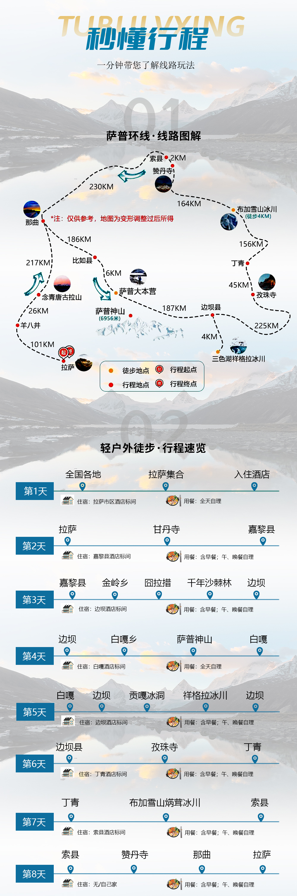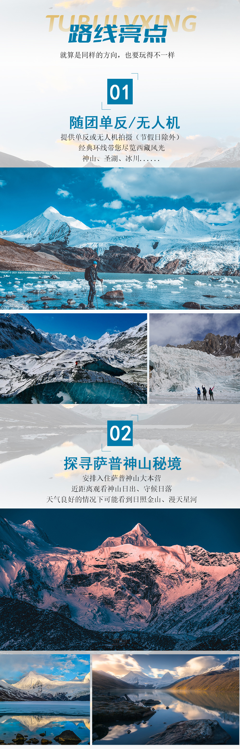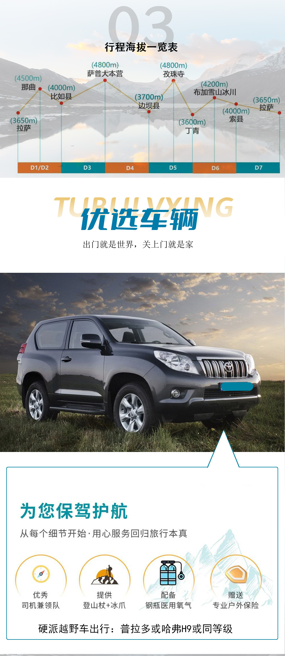 (2)全程徒步约10公里,平均海拔为4400米左右,徒步最高海拔为萨普冰川4900米,住宿最高海拔为白嘎乡4010米左右。