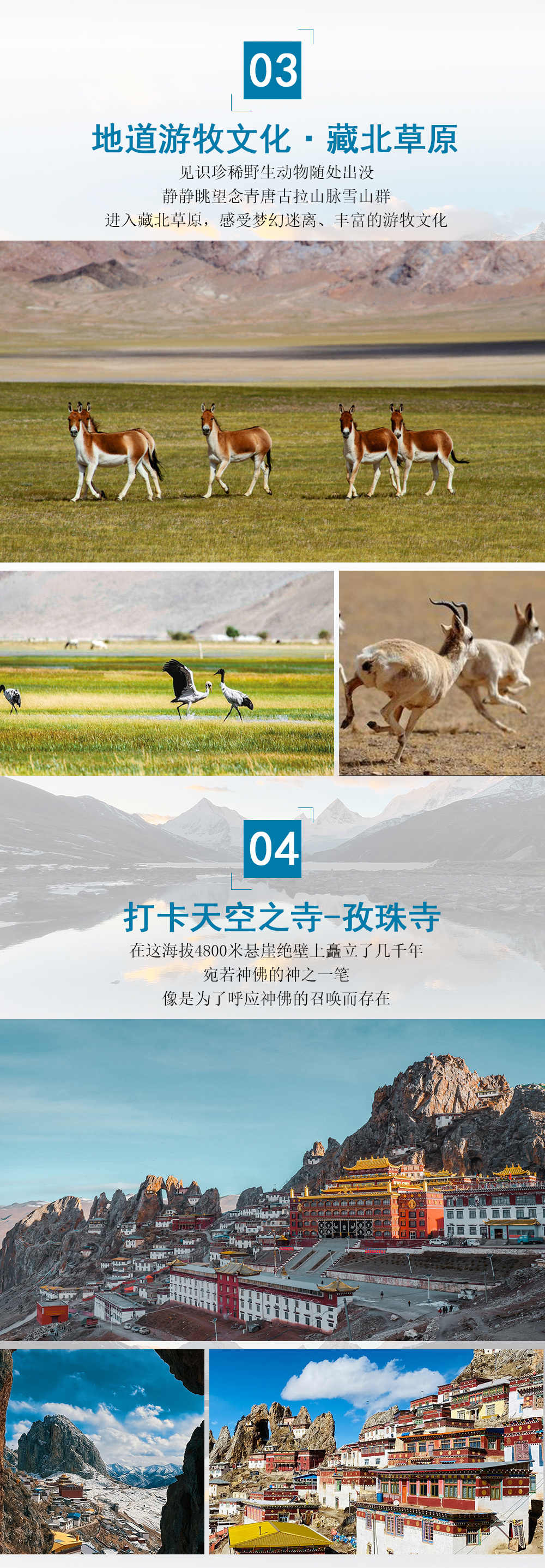 早餐后我们将去参观“藏北小布达拉宫” 赞丹寺,之后返回拉萨,途经那曲沿109国道青藏线公路向南进入藏北草原,一路广阔的高山草甸与蓝天白云。远处,群山巍巍,白雪皑皑,蓝天、白云、雪山、随处可见的珍惜野生动物,藏北草原不仅是野生动植物的天堂,同时也是一个具有丰厚沉积层的文化沃土。生活在这里的牧民创造了梦幻迷离、色彩斑斓的游牧文化。不仅有远古岩画,也有许多古象雄国的遗址,英雄格萨尔王的足迹及故事遍布藏北,玛尼堆、经幡、古塔随处可见……晚上7点左右到拉萨,本次活动结束,建议大家预定第二天返程机票。