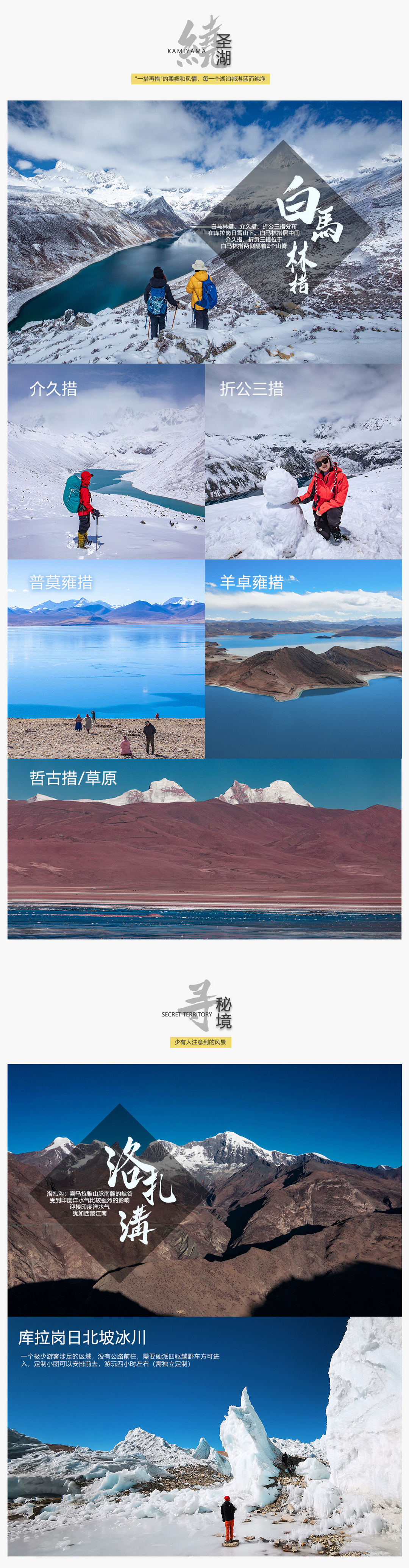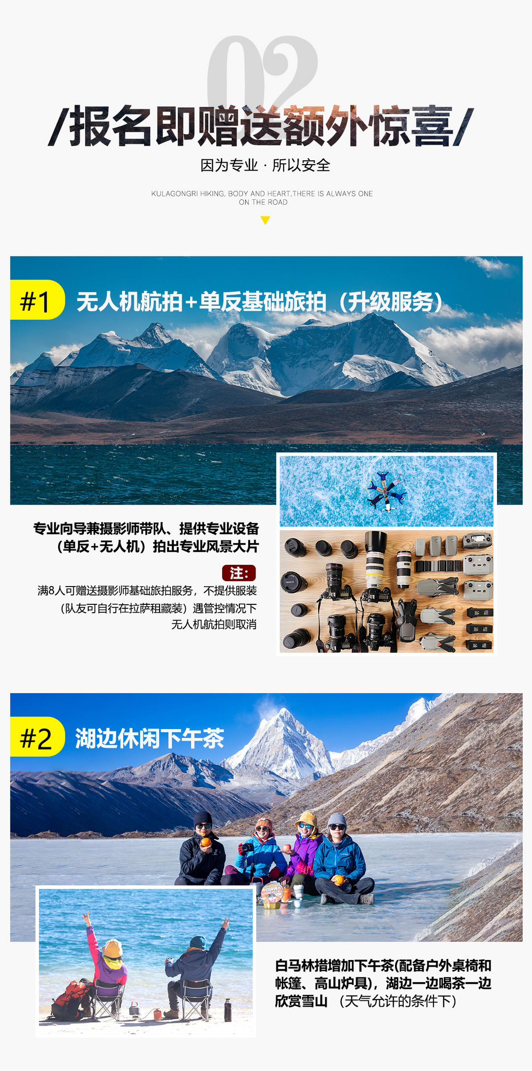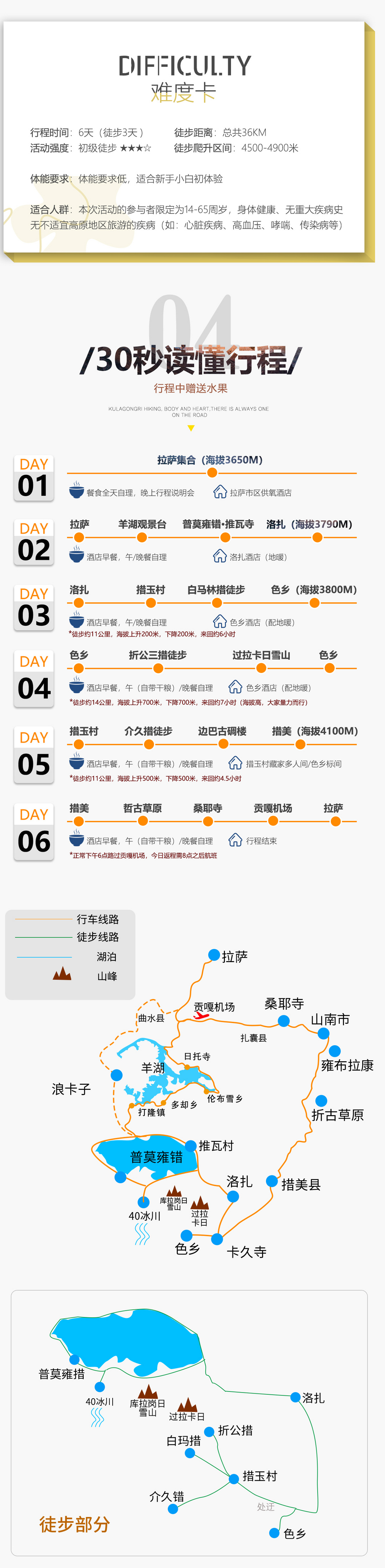 (1)全程徒步约30公里,徒步平均海拔为4700米左右,徒步最高海拔为折公措垭口5000米左右,坐车最高海拔为蒙达拉山口5363米,住宿最高海拔为措玉村4160米。