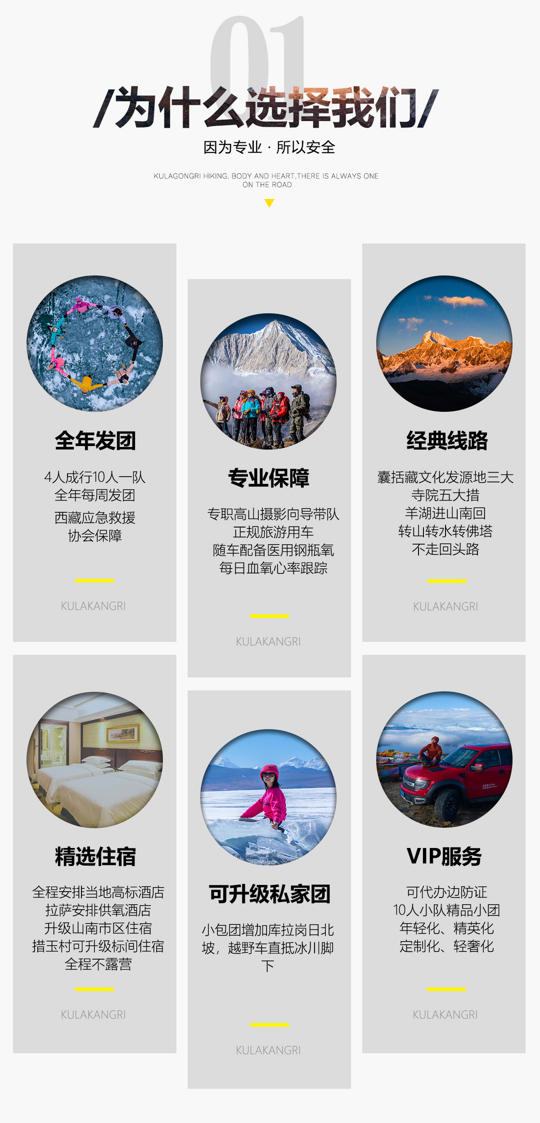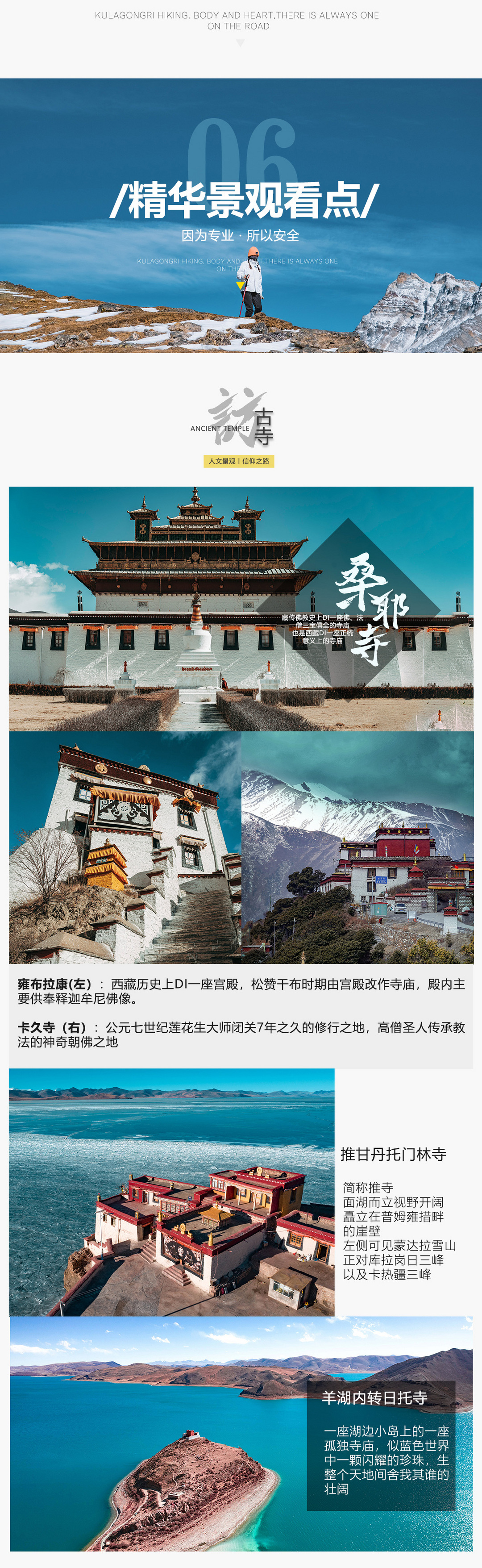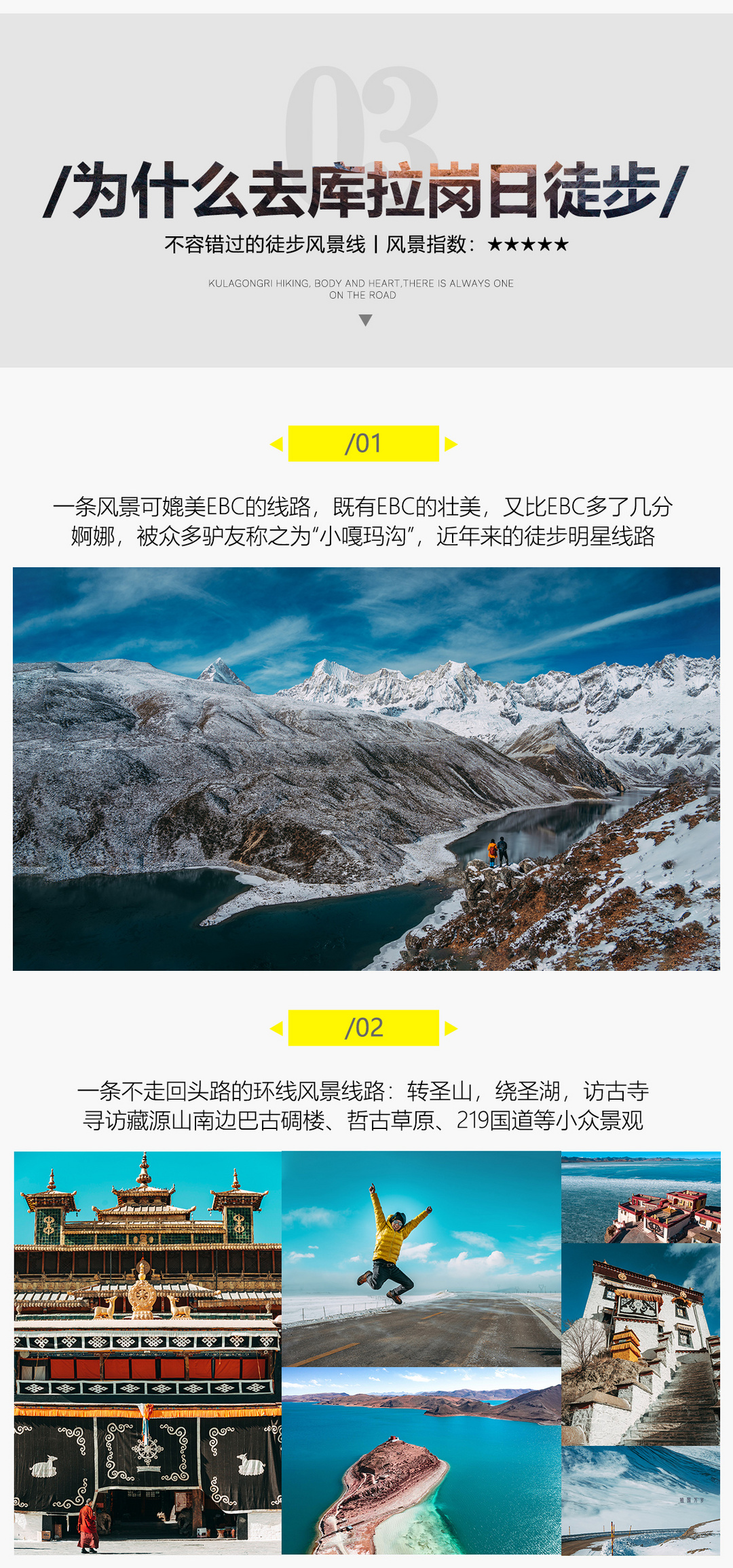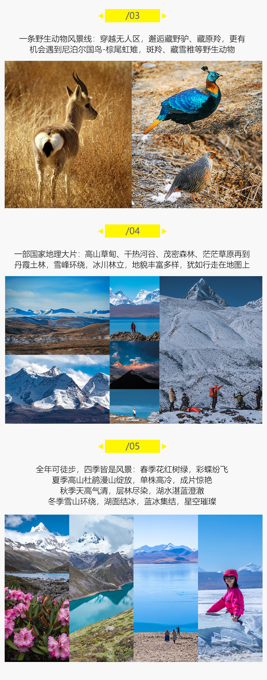 (1)全程徒步约30公里,徒步平均海拔为4700米左右,徒步最高海拔为折公措垭口5000米左右,坐车最高海拔为蒙达拉山口5363米,住宿最高海拔为措玉村4160米。