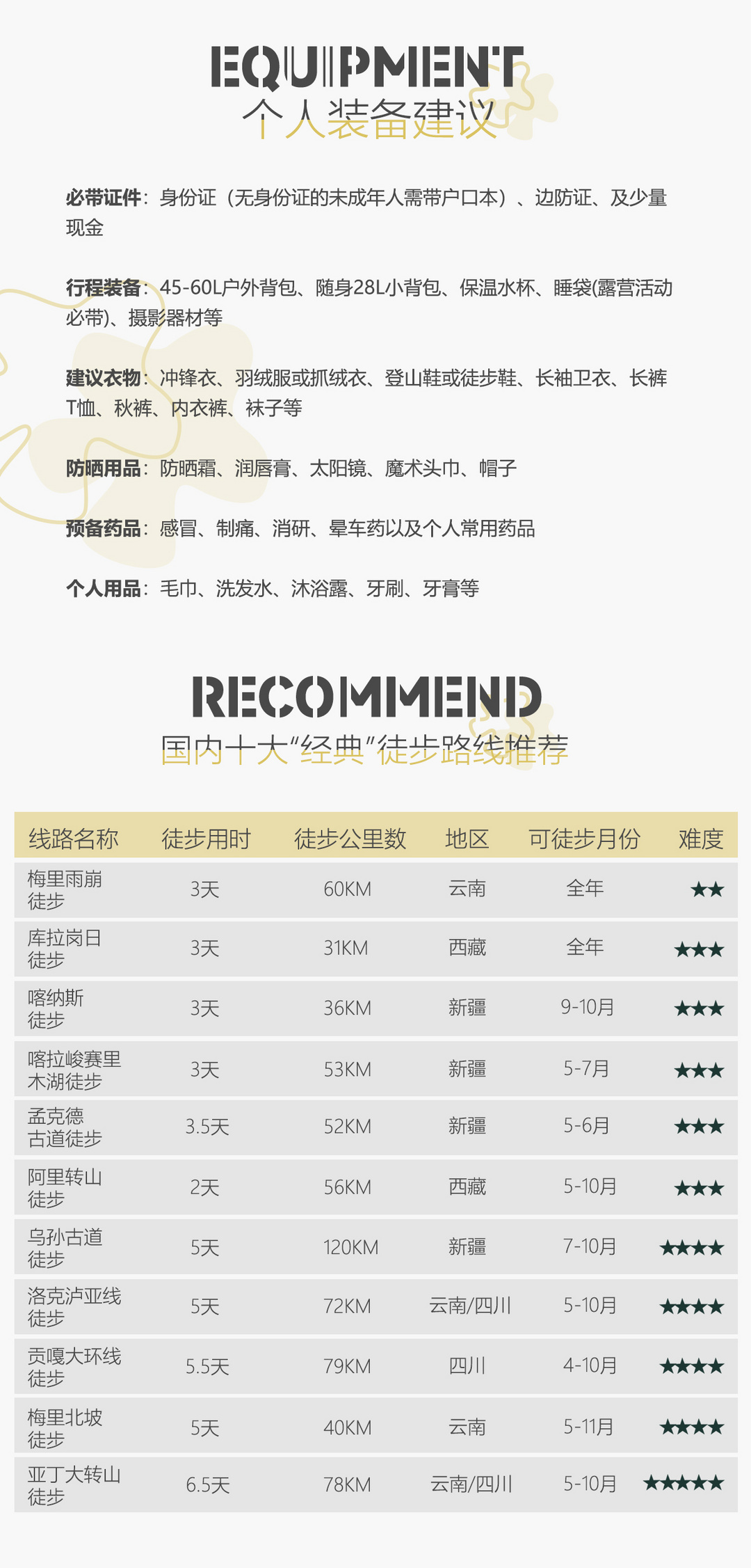 (1)全程不含午餐,提前准备3天徒步中午的路餐,建议准备易携带、热量较高的食物:巧克力、士力架、面包、坚果、牛肉干、水果等。