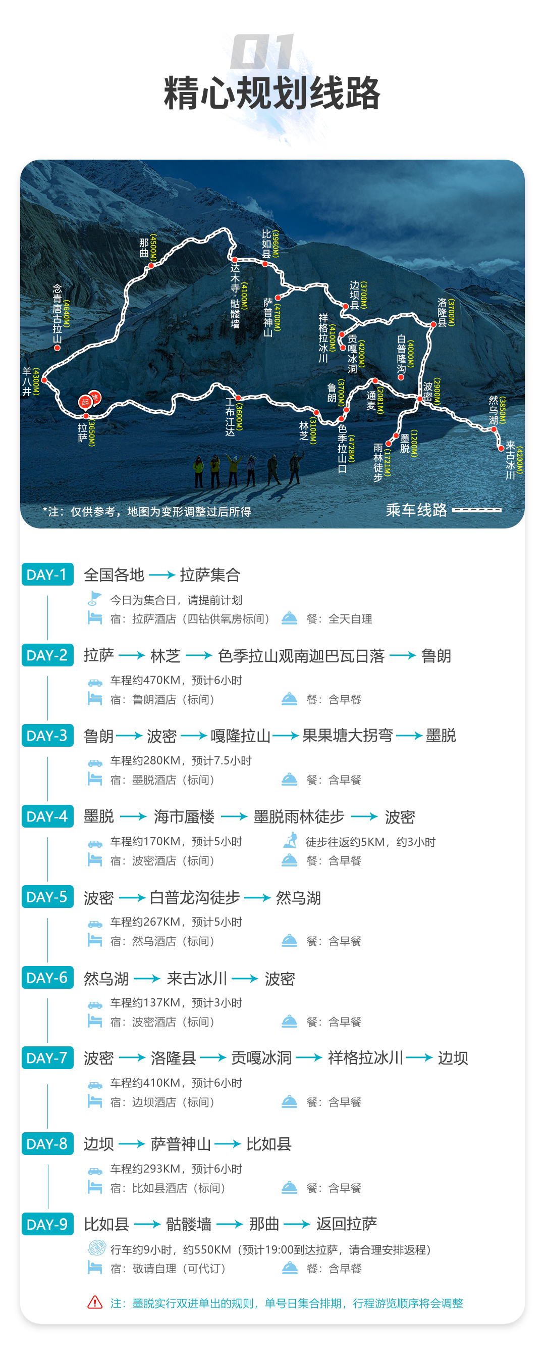 注:墨脱实行双进单出的规则,单号日集合排期,D3-D6行程游览顺序将会调整如下: