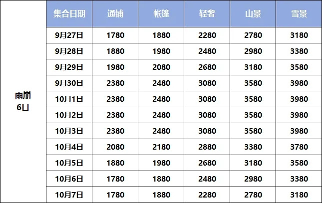 备注:以上价格仅区别雨崩村三晚住宿;丽江、飞来寺 住宿一致;