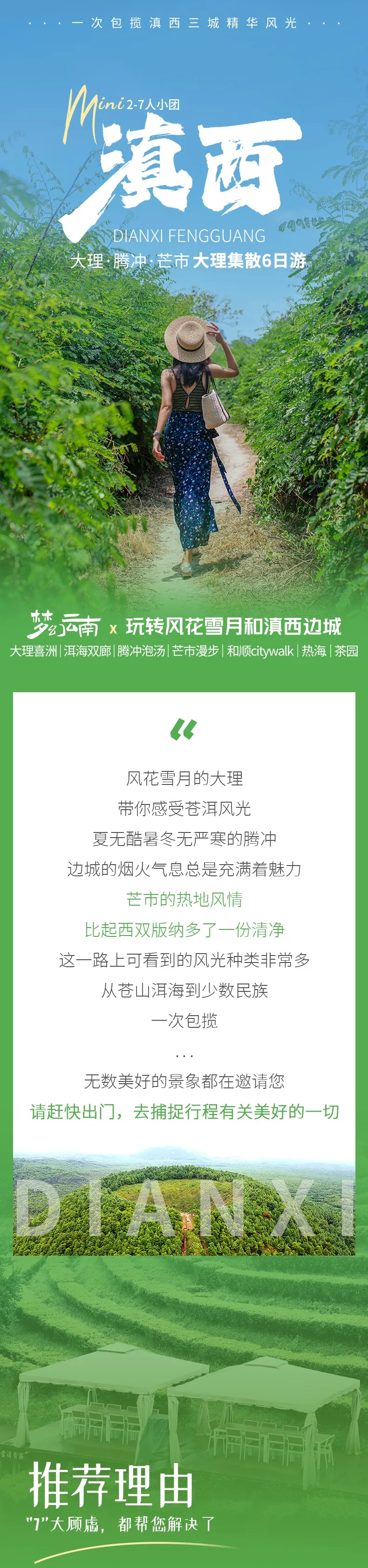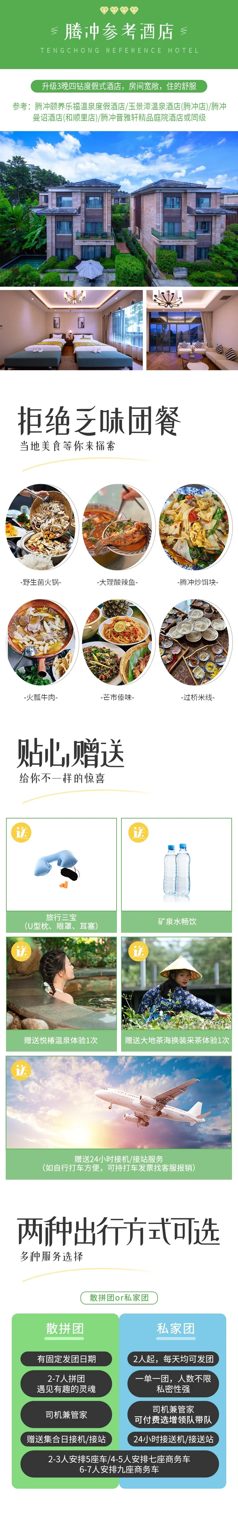 1、住宿:大理2晚三钻酒店(参考:础云酒店或花筑·睿苑(大理古城)或云悦楠舍或花筑·大理古城红龙井君睿精品客栈(苍山门店)或同级),腾冲3晚四钻酒店(参考:腾冲颐养乐福温泉度假酒店或玉景潭温泉酒店(腾冲店)或腾冲曼诏酒店(和顺里店)或腾冲晋雅轩精品庭院酒店或同级);