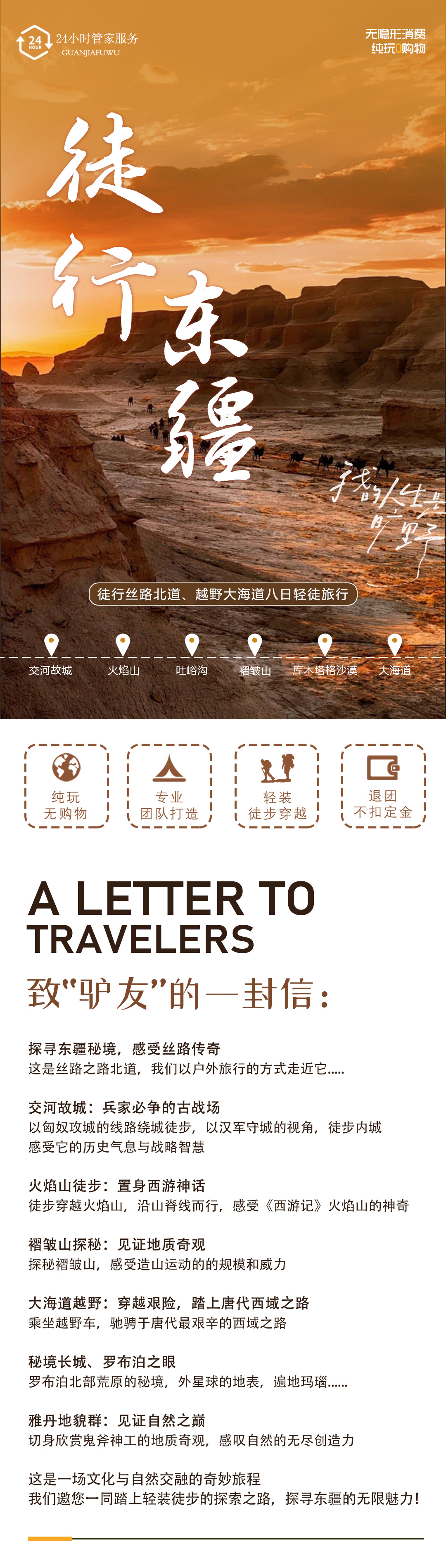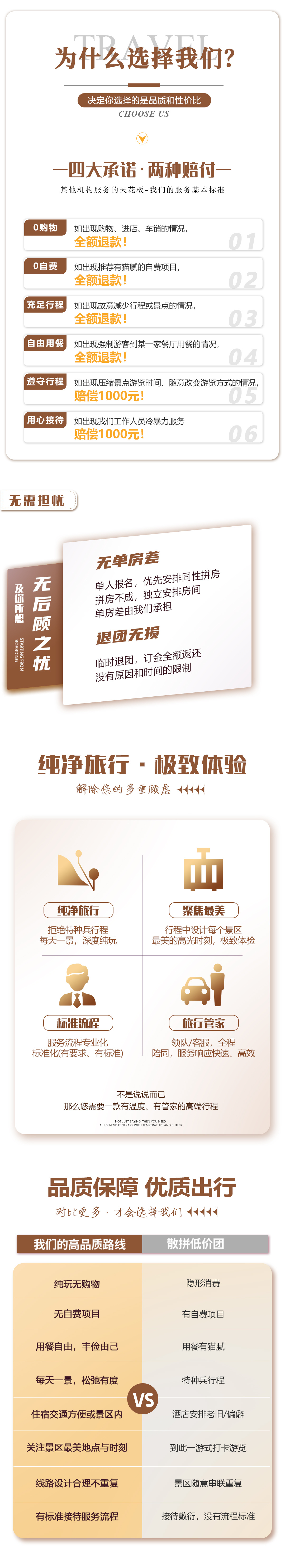 我们的活动保证纯玩无购物,如在活动进行中,因个人原因在景区、餐厅、体息区等地的购物场所消费,我们需要提醒您:理性消费并索要凭证,如产生消费争议,将由您与售卖商品的商家自行解决。
