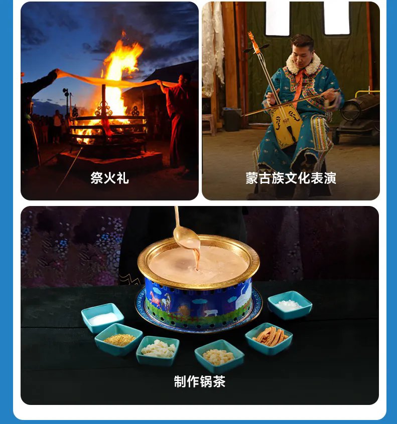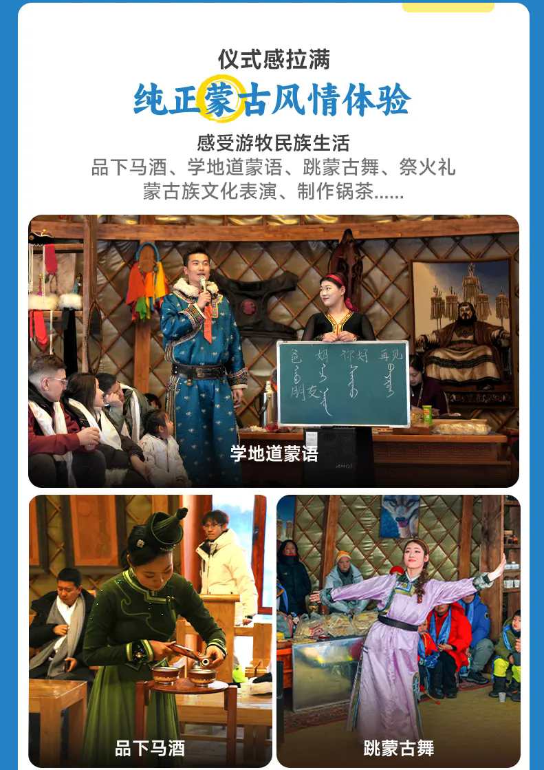 午餐后,我们到达【游牧体验园】,在这里可以放肆开玩,体验雪地爬犁冲浪、高山滑雪圈,参加蒙古族祭火大典,在暖喝的蒙古包内与热情蒙古人学蒙语、跳蒙古舞,观看群狼夺肉、马头琴表演,喂食草原精灵梅花鹿,品尝下马酒、奶皮子、奶豆腐,全方位感受蒙古族风情。