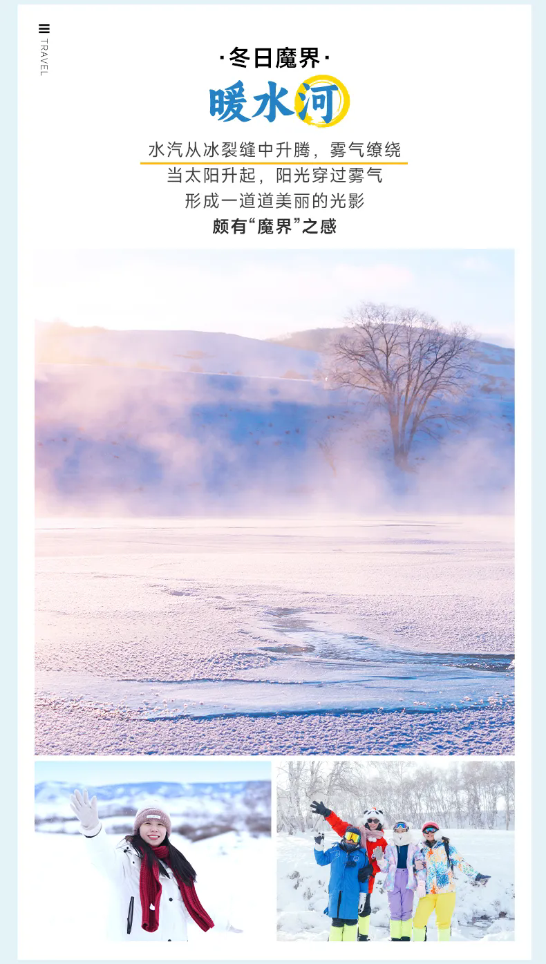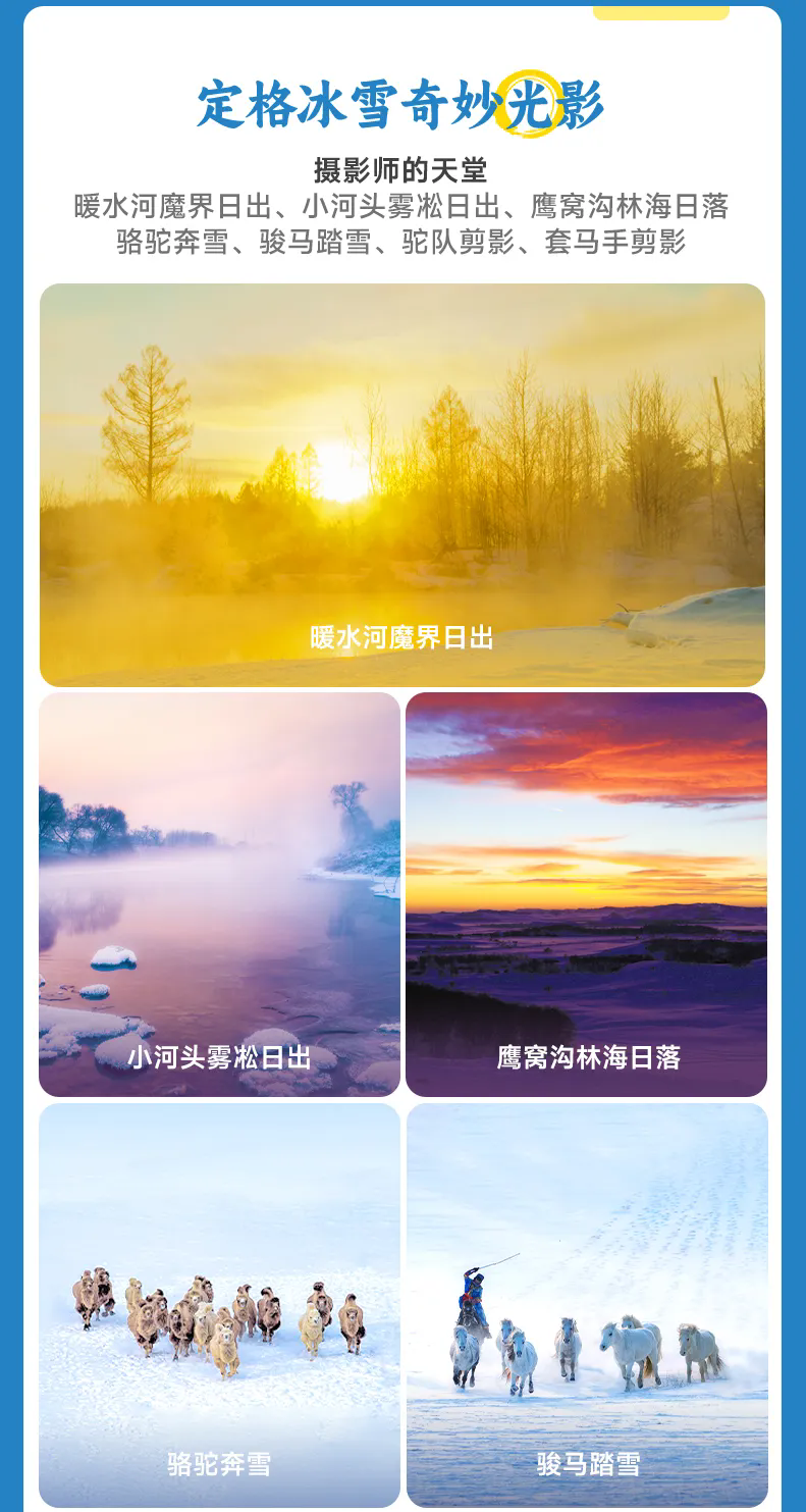 今天我们要早起,乘坐越野车前往号称“魔界”的【暖水河】观赏日出(车程约40分钟),我们在坡顶支好摄像设备,可以看到沟地的河流还有未冻结的部分,日出时分水雾蒸腾起来,烟雾缭绕...太阳逐渐从地平面升起,从远方的山坡间“挤”了出来,天边的云从暗青色转为了暖橘色、粉色...大家要耐心等待日出,一定不会让你们失望!