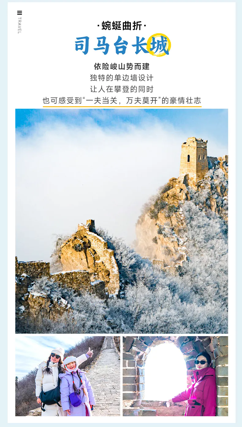 早餐后,我们一起登临【司马台长城】,俯瞰冰雪长城蜿蜒百里,好似龙腾山岳的壮观冬景。这里是唯一保留明代原貌的古长城,整个长城城墙依险峻山势而筑,以奇、特、险著称,保存有完整的20座敌楼,尤其望京楼筑于海拔千米的陡峭峰顶,司马台长城被联合国教科文组织确定为“原始长城”。英国的泰晤士报2012年将司马台长城评为“全球不容错过的25处风景之首”。