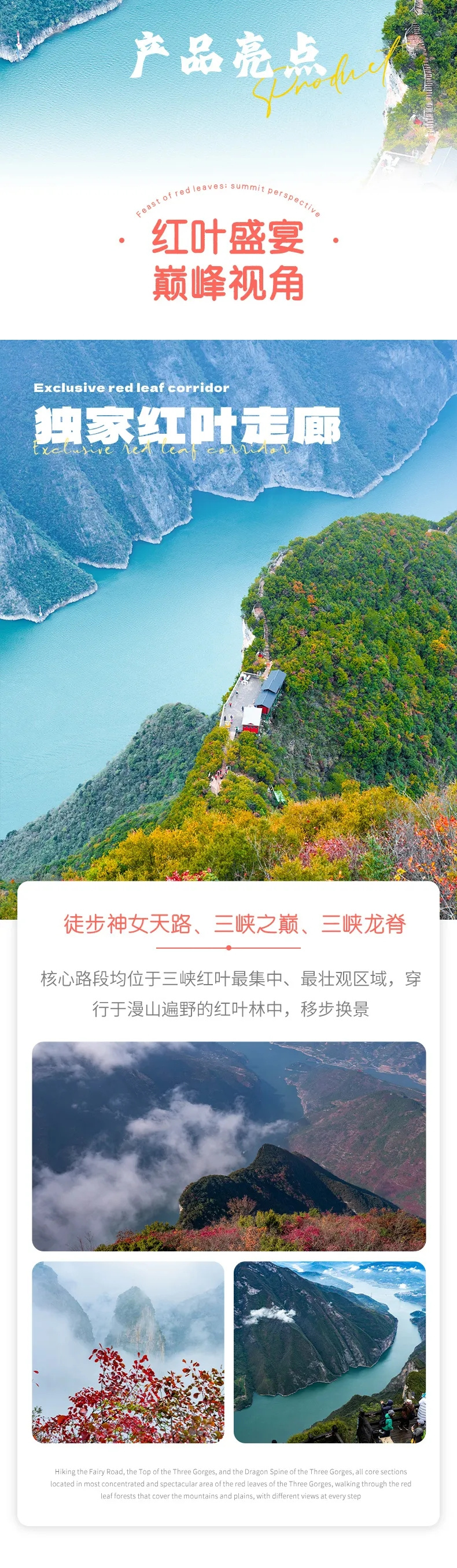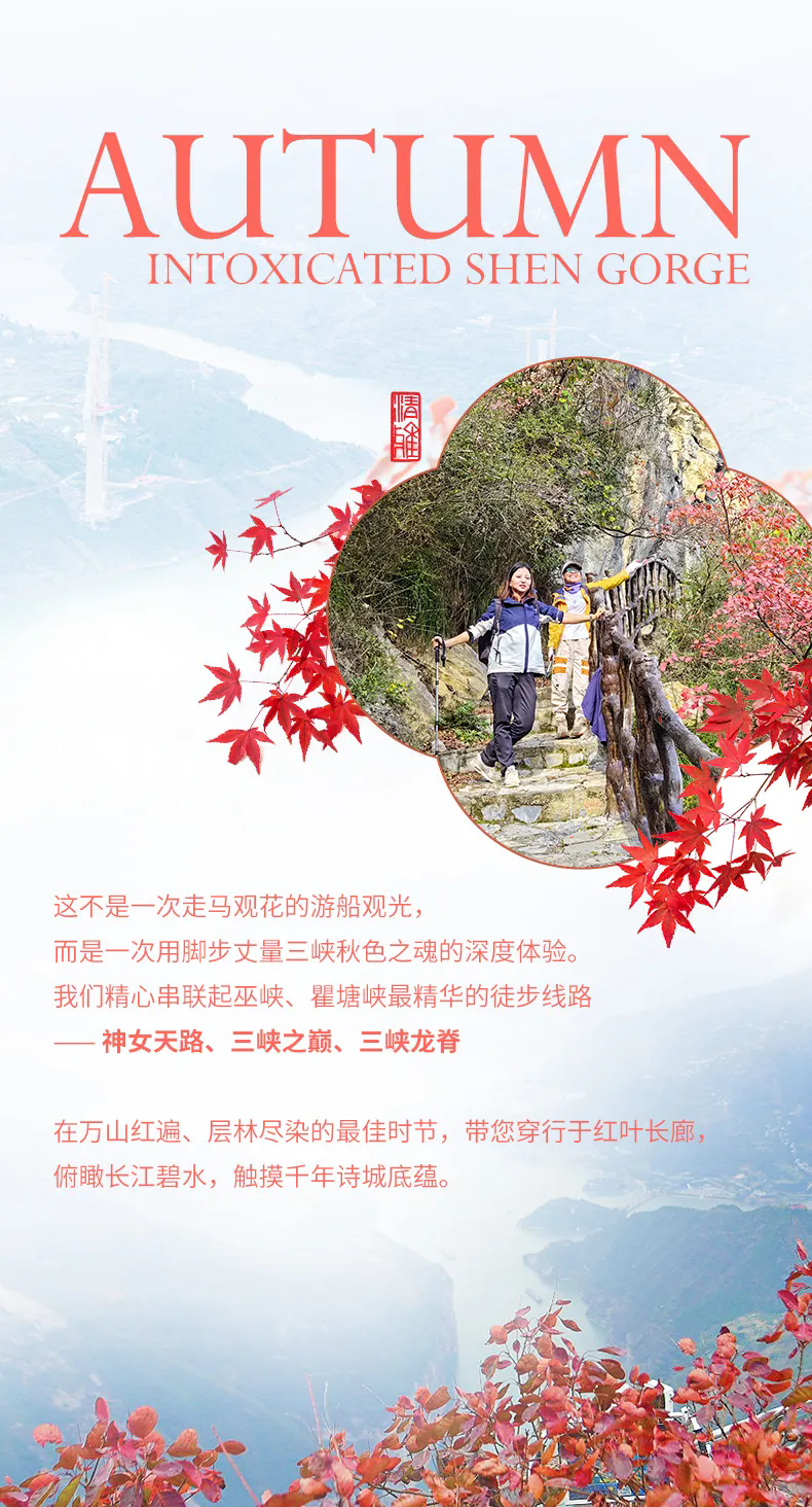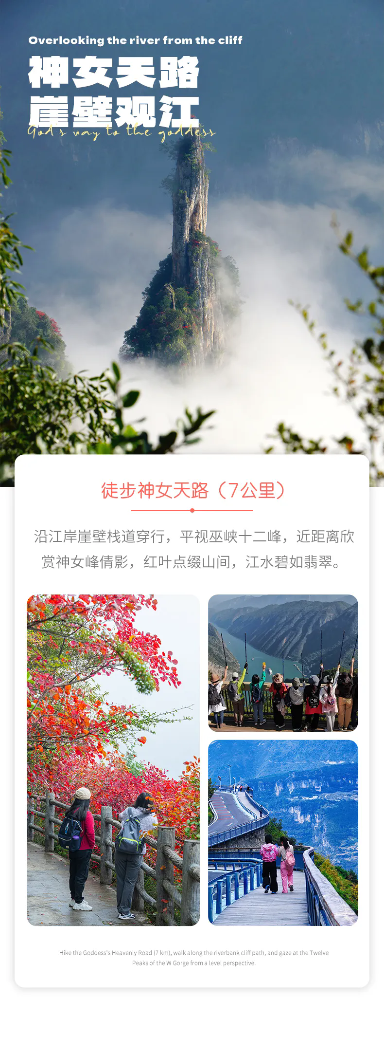 我们将乘车前往巫山神女天路,走一段风景绝佳的红叶路线,在如火如荼的红叶里穿梭,近距离接触红叶。一路穿越巫峡,欣赏“曾经沧海难为水,除却巫山不是云”的壮观景象,一路红叶相伴,美不胜收,这里也被驴友评为长江上最美的三峡画廊