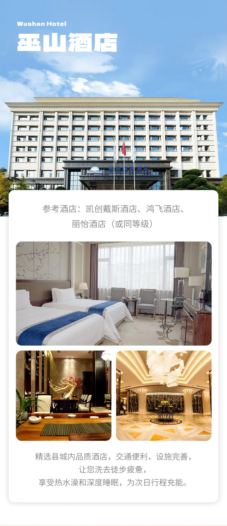 住宿:巫山四钻酒店,参考凯创戴斯酒店、鸿飞酒店、丽怡酒店等;