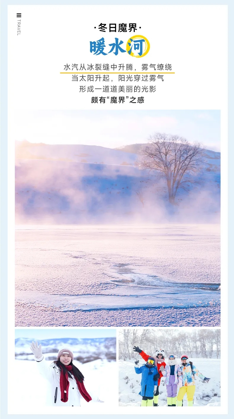 今天我们要早起,乘坐越野车前往号称“魔界”的【暖水河】观赏日出(车程约40分钟),我们在坡顶支好摄像设备,可以看到沟地的河流还有未冻结的部分,日出时分水雾蒸腾起来,烟雾缭绕...太阳逐渐从地平面升起,从远方的山坡间“挤”了出来,天边的云从暗青色转为了暖橘色、粉色...大家要耐心等待日出,一定不会让你们失望!