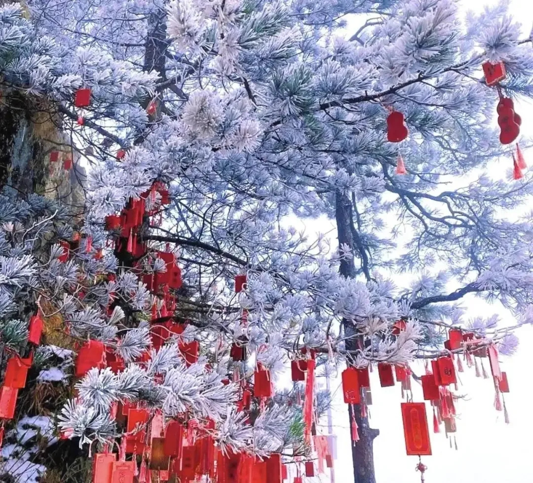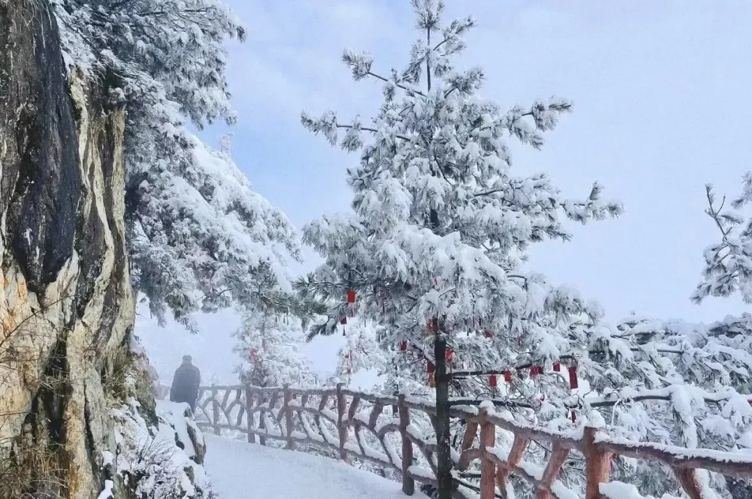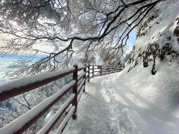 山上白雪覆盖,与耸立青松相应,犹如一幅壮丽的水墨画。无垠白雪掩盖山石的苍凉之色,展现出极尽纯粹的无华之美。雪稀释了所有喧哗,仿佛身处雪域圣境般安静清明。
