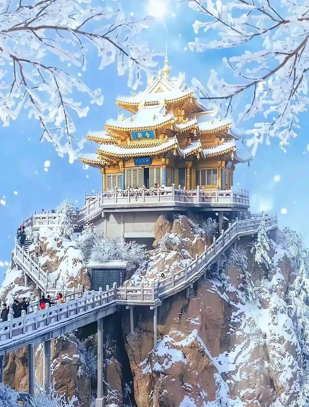 金殿建筑群依托山顶而建,巧夺天工、自然天成。构成一幅“天人合一”的完美画卷。雪中的金殿更是静谧安详,浑然天成、雄伟大气。