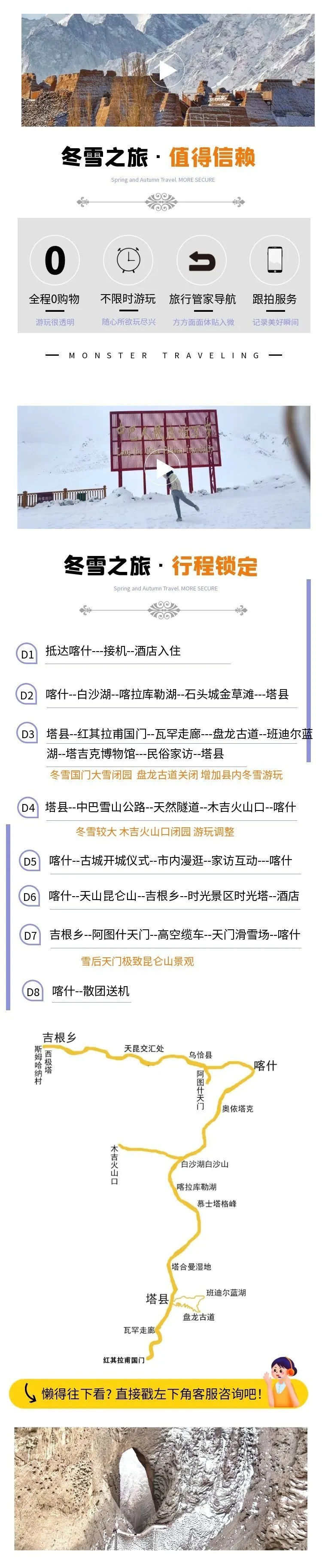 2、冬日游南疆,昆仑山雨雪天气较多,如遇大雪景区闭园,门票区间车现退,灵活调整游玩景点,沿途都是风景。