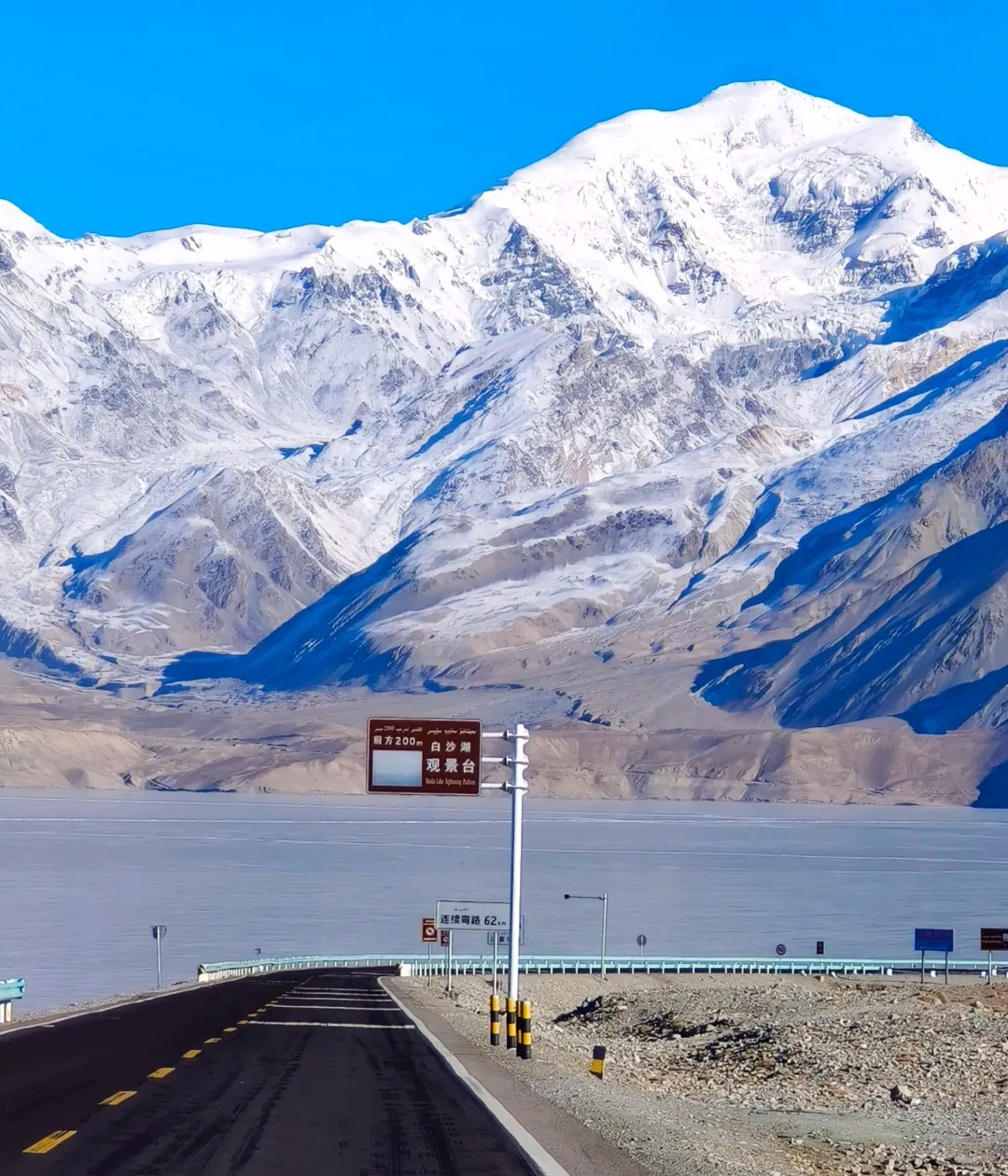 出塔县一路上行150公里便到红旗拉甫国门口岸,祖国海拔最高的边防哨所。一场大雪过后,一路盘山路歪歪扭扭的上来,眼前几乎是一片白茫茫,一条黝黑的雪山路直达国门。此时海拔接近5000米,冷的你怕是手机都拿不稳了,拍个照匆匆下山。很快就到了瓦罕走廊石碑处,证明几位高僧的石碑仍屹立风中,河谷对岸就是瓦罕走廊绵延几百公里一直到边境,雪山雪景相伴,此一时的古道淹没在群山冰雪世界里。回塔县方向路过达布达尔村落,右拐入盘龙古道,一眼望去,33公里长的盘山路像巨龙一样横卧昆仑山顶,盘龙脊两侧顺坡而下,偶有随时滚落,或是盘龙苏醒了。下盘龙,过瓦恰乡河谷前行班迪尔蓝湖,这里因为水资源利用发电而兴建的水库,群山环保之中的湖泊,幽深蔚蓝,自成景色。穿过高架桥,两侧湖水悠悠,山色轻鸣,像有了生命一样,与你同行,共话昆仑。