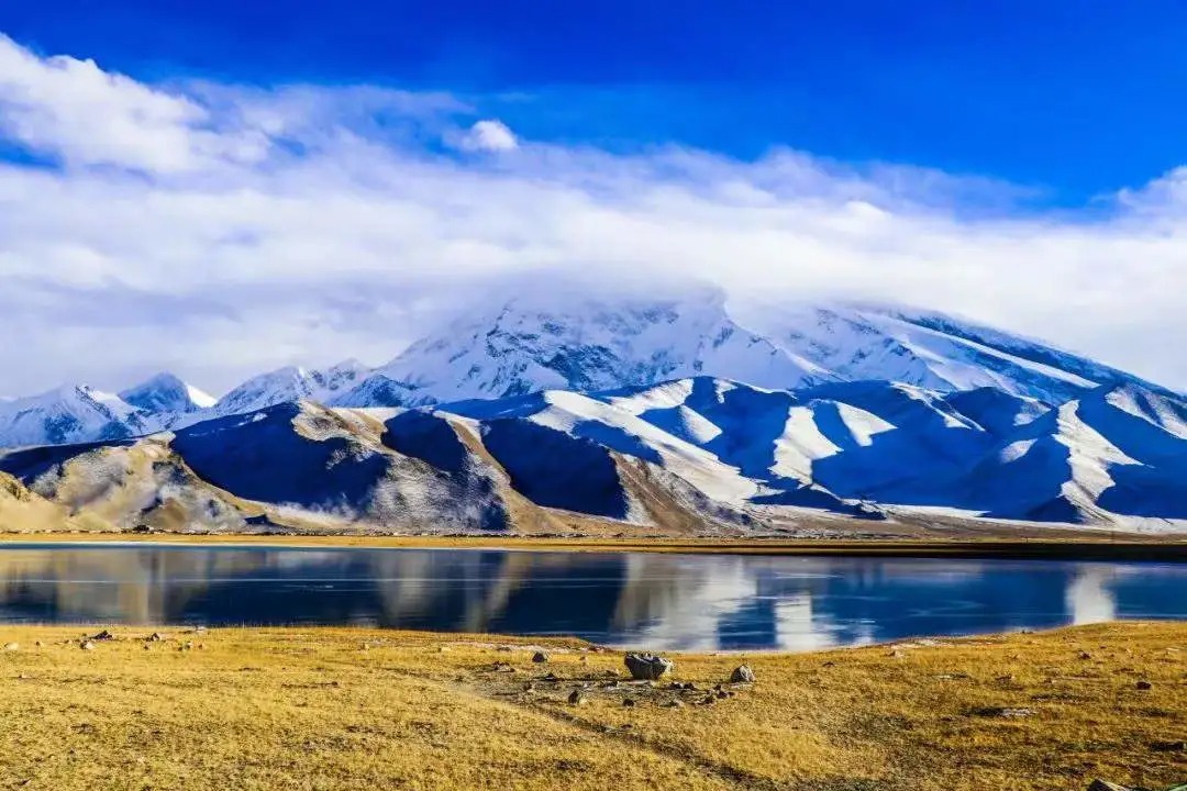 路过白沙湖再往前30多公里来到喀拉库勒湖,像静静的在听着慕士塔格峰的故事,光线打过去,冰面雪峰倒影若隐若现,一派梦境般真实又虚幻。