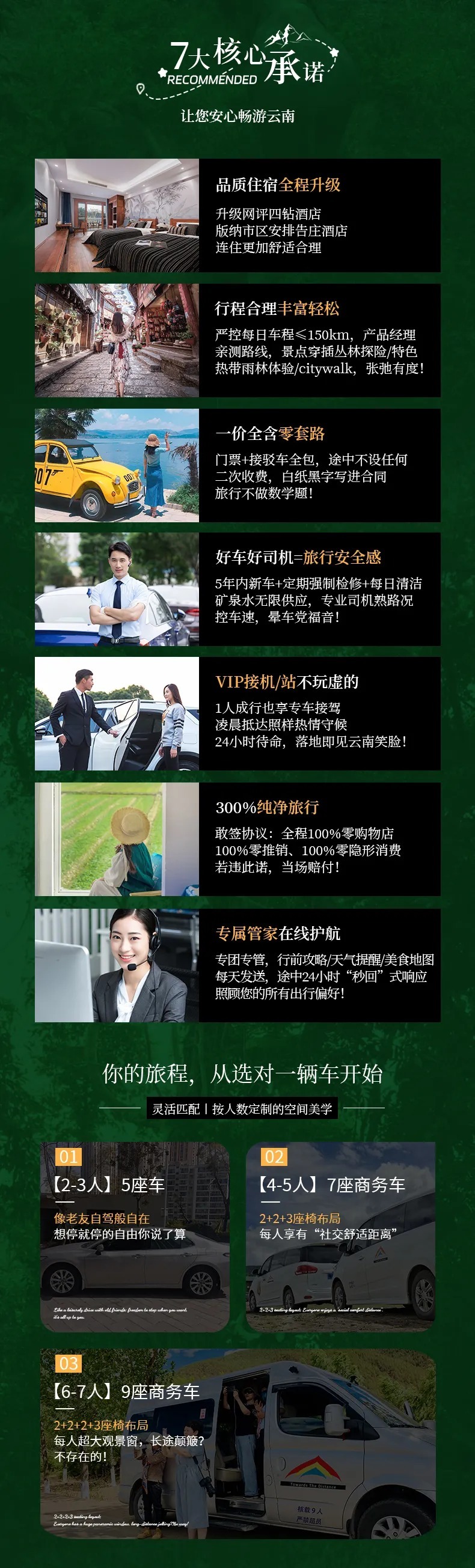 3、用车:2-3人安排5座车,4-5人安排7座商务车,6-7人安排9座商务车;