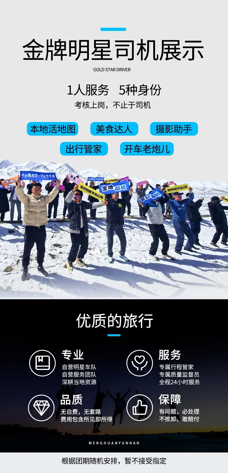 5、司导:司机兼管家,帮助大家购买门票,给团友游玩建议,无法全程陪同进入收费景区和提供专业讲解等服务,敬请谅解;