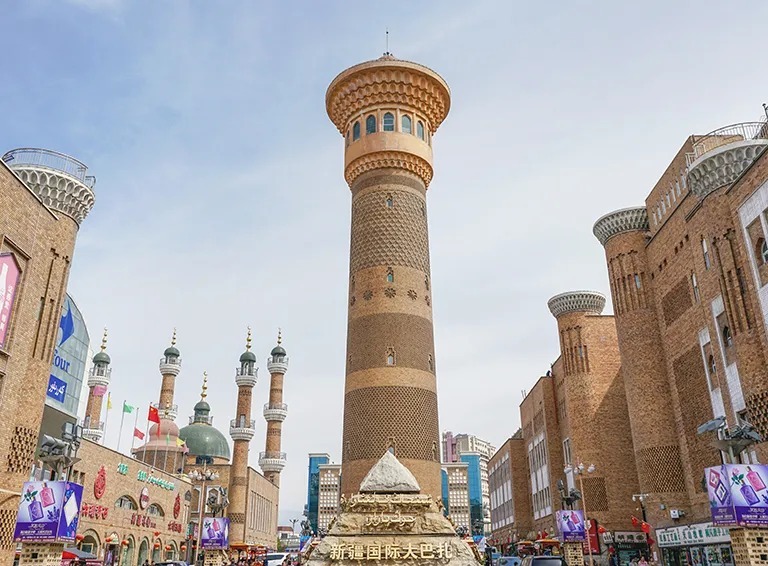 【国际大巴扎】——世界上规模最大的巴扎(巴扎为维吾尔语,意为集市)。具有浓郁的伊斯兰建筑风格,体现了浓郁的西域民族特色和地域文化,这里除了有令人眼花缭乱的商贸市场外,还有美食广场、观光清真寺、80米高的新疆第一观光塔等设施。