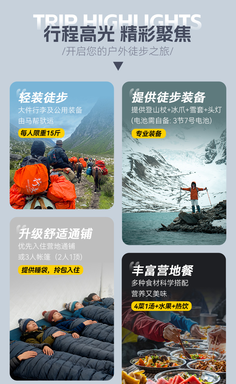 5.行李驮运:每人限重15斤(超重需要补差,5斤/200元往返;6-10斤/300元往返;11-15斤/400元往返)。