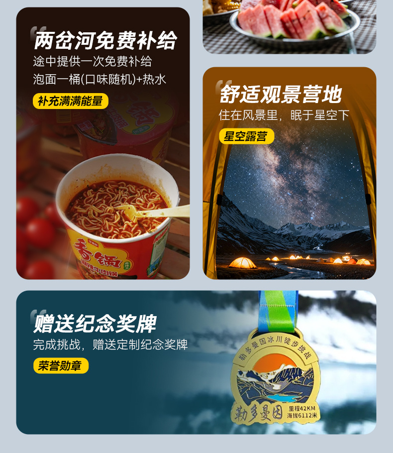 2.个人路餐3顿(建议携带坚果、巧克力、牛肉干、葡萄干、能量棒、榨菜、水果、面包、饼干等高热量易携带食品)