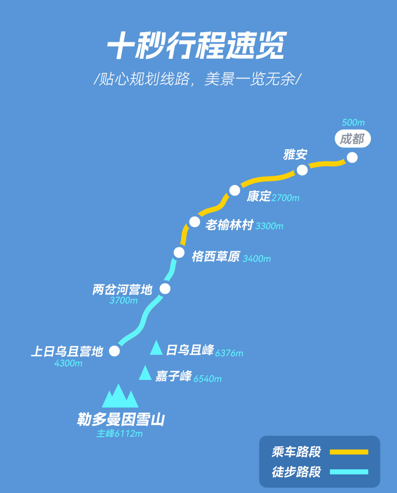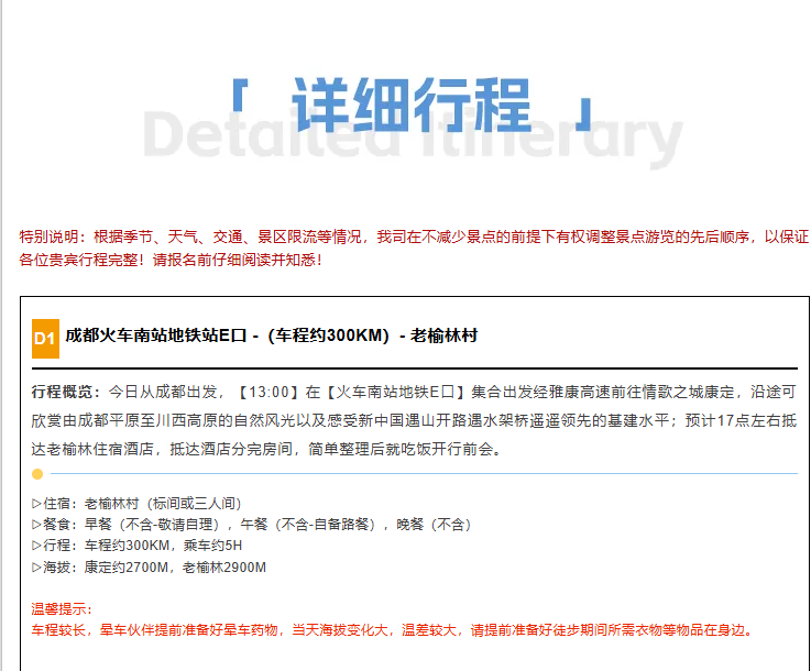 1.交通:成都往返根据人数选择合适车型,一人一整座(拼车或包车);老榆林—格西草原中转车。