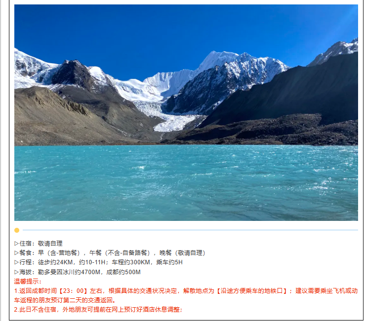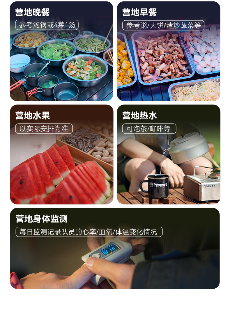 3.餐食:全程所列餐食合计1正2早,营地餐参考汤锅或中餐。